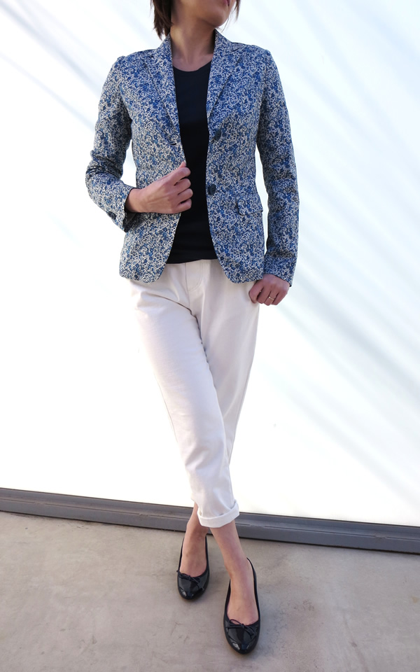 まさに春が来た!・・・と思うリバティの小花柄のコットンジャケット登場。女性らしく、優しい雰囲気に仕上がっています。お袖を曲げて、デニムやハーフパンツなどと合わせて、カジュアルダウンさせて着こなしても良いですね!当然、キチンとした雰囲気でもOKです。 ボトムに合わせたパンツは、上の写真のカットソーシリーズのパンツ。入荷して早々完売です!着心地満点シリーズなので、ジャケット、スカートの気になる方は、お早めに!