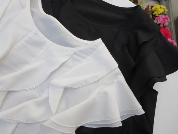 軽やかで、上質感のあるコットン・シルク混合ローン素材を使用したデザインブラウス&スカート。トップスは、全面に大振りなフリルがあって、よりフェミニンな雰囲気にしてくれます。上下合わせて、ワンピース風に着て頂くのも良し、それぞれ単品で、カジュアルダウンさせて着て頂くのもGOOD! スカートは、2月17日のブログでもご紹介していますが、ブラックの無地とヴィンテージ風の柄と2種あって、どちらも素敵!