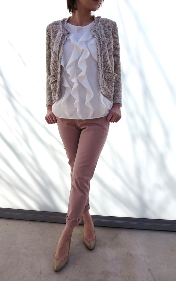 ツィード風のニットカーディガンに、大人可愛らしいピンクのパンツを合わせて、春らしい柔らかな雰囲気に仕上がりました!インナー使いすれば、フリルもさりげなく良い感じですね。
