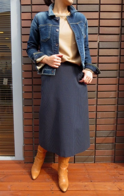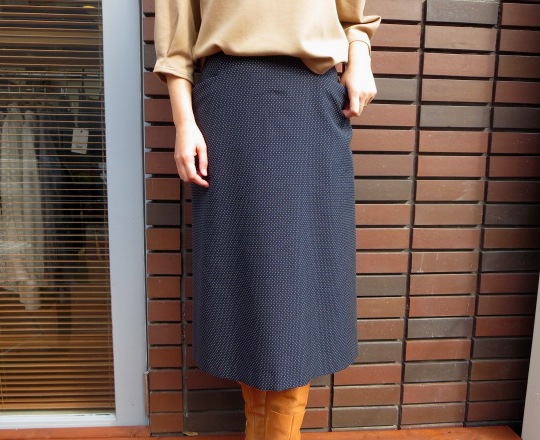 まずは、【le ciel de HARRISS】のミディ丈のスカートです。体に沿う女性らしい美シルエットで、カジュアルスタイルにも上品にもお使いいただけます。細かなドットがカラーに奥行きを与えてくれます。
