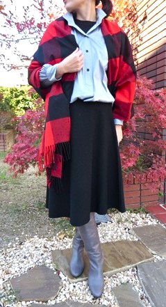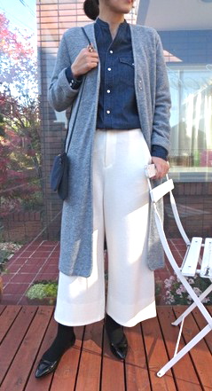 ブルーグレーのシャツを使ったコーディネートをしてみました。インナーに薄手のニットを着れば、シャツをメインにコーディネートを楽しめます。ポイント使いとして赤のストールを羽織れば、防寒としても〇。パンツコーデには、ニットカーディガンのインナーとして着用。黒の釦もアクセントになりますね。