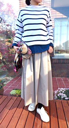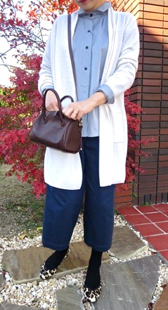 お色はブルーでも落ち着いた感じのライトブルーです。上記コーディネートで着用のライトベージュとで2色ご用意。
