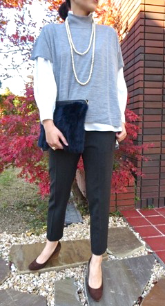 今シーズン大人気で、残り1点上記のお色のみとなってしまったHarrissのフェイクムートンは落ち着いたチャコールグレイ。冬のお出掛けには温かさだけでなく、モチベーションも大切。こんなコーディネートならきっと気分よく出掛けられそう。そしてコートを脱いだら、柔らかいライトグレイのJOHN SMEDLEYのハイネックニットをフェミニンにノーアクセサリでワイドパンツにインしてみました。 鉄板カラ―であるネイビーのパンツはHARRISS GRACE。ウェストがゴムなのでお食事会のときも安心?