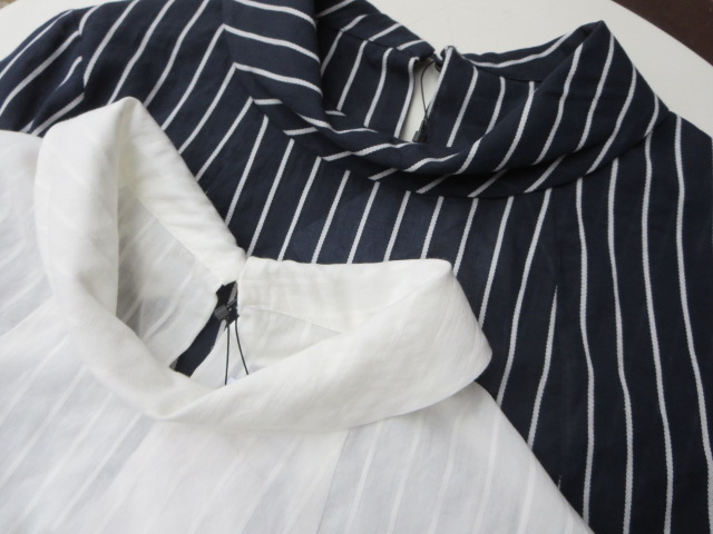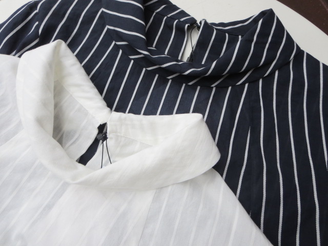 ブラウスの裾は、後ろが少し長めになっているので出して着て頂いても良いデザインとなっています。ホワイト&ネイビーどちらも良いカンジです。