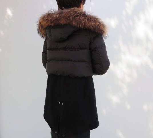 周りに差が付く個性派シルエットが魅力のダウンコートはいかがでしょうか!大胆な異素材切り替えで、レイヤード風に仕立てたこだわりのディテールがポイント。フードとファーが取り外し可能なので、色々な表情を楽しめるのも嬉しいところです。ファーには、華やかな雰囲気のあるラクーン(タヌキ)を使用しています。