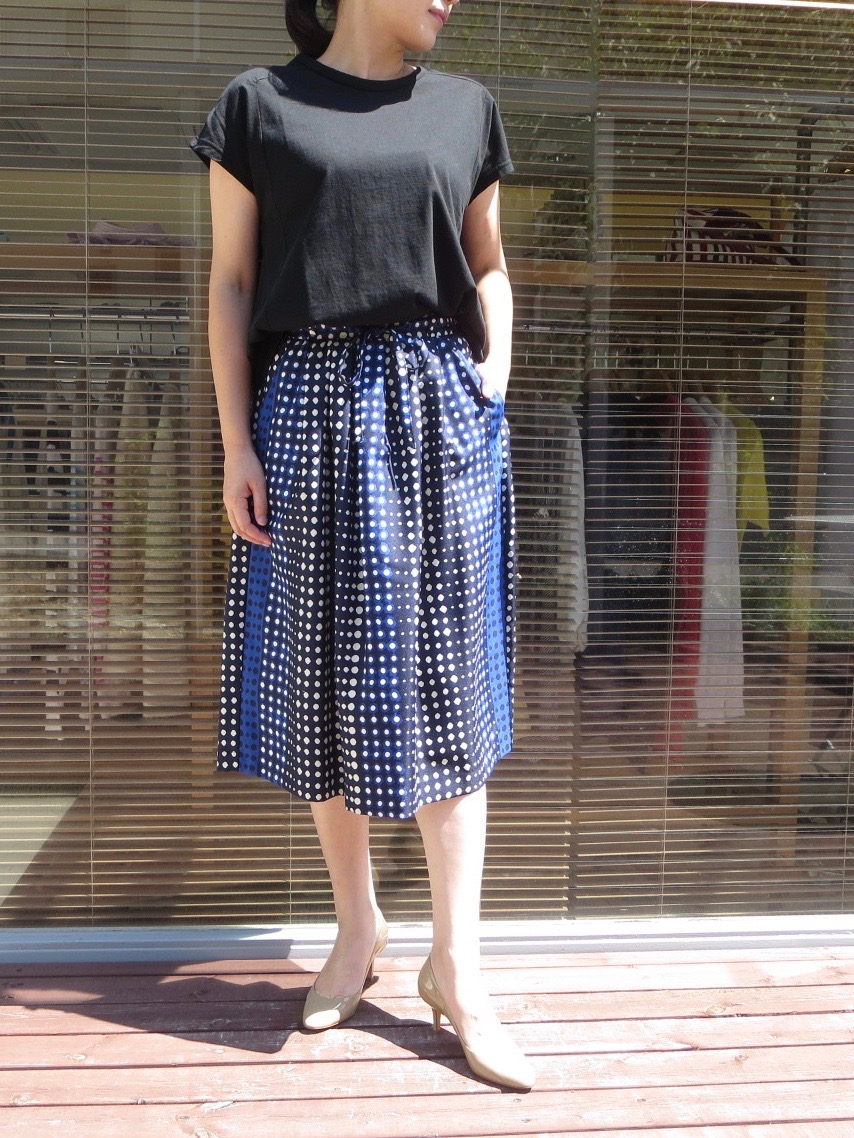 秋らしいシックな雰囲気のスカートは穿くだけで、気分は盛り上がります。今はカットソーで、もう少し涼しくなったらニットやタイツと合わせるのが楽しみなスカートです。