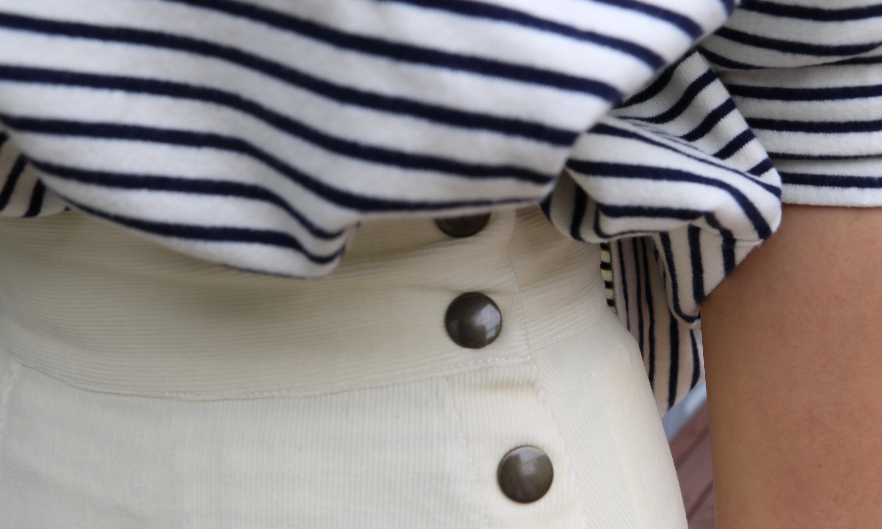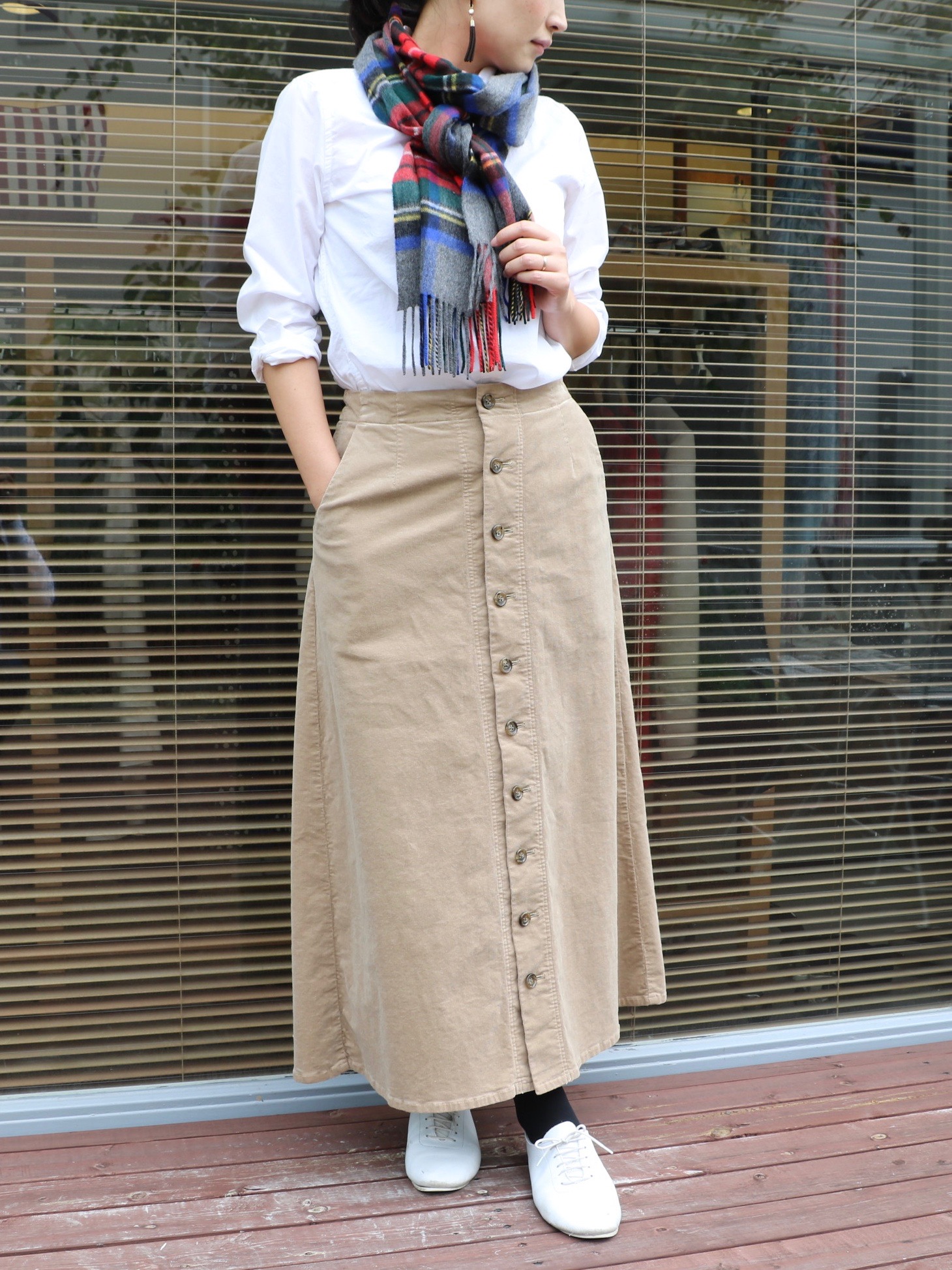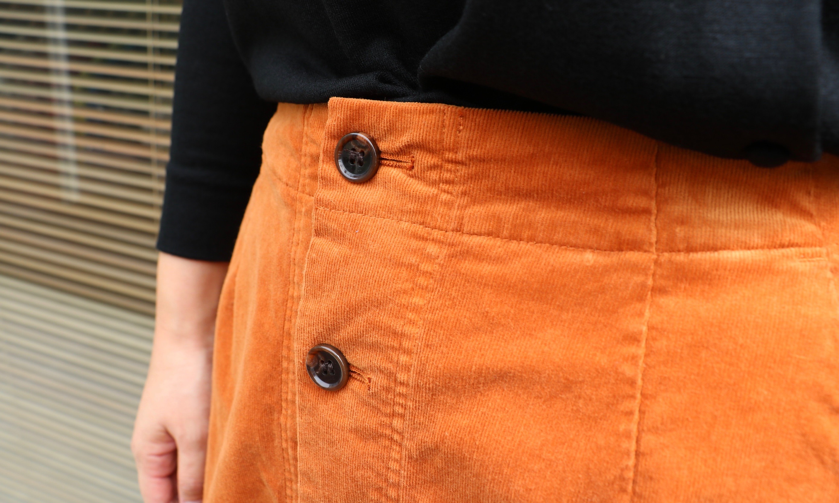 過去のブログでも何度か登場していましたが、やっとご紹介することができました。フロント釦のシンプルなタイトスカートで、コーデュロイの生地がまさにトレンドです。