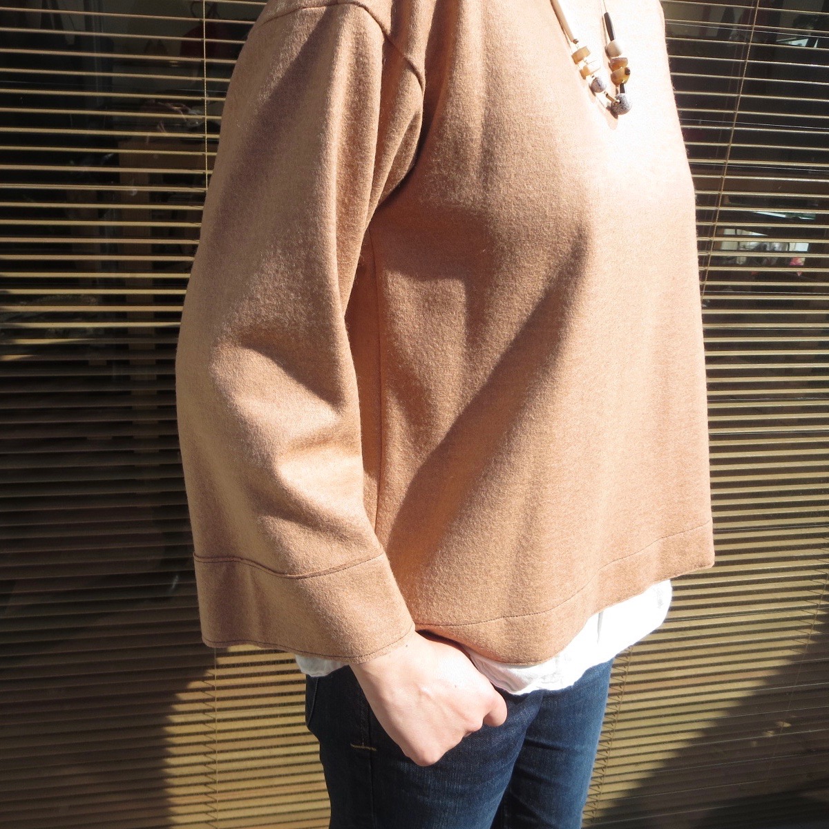 まずはトップスを使って、カジュアルなコーディネートで。明るいキャメルで肌馴染みも良く、デニムと合わせるだけで、どこかエレガントな雰囲気を感じさせます。