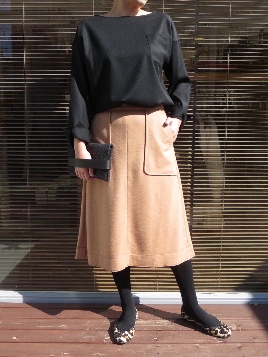 キャメルと合わせると、ぐっと大人っぽい雰囲気にしてくれる黒のトップスでスタイリング。膝下のフレアースカートは、今年のトレンドでもありますので、これからの冬に大活躍してくれること間違いなしです。