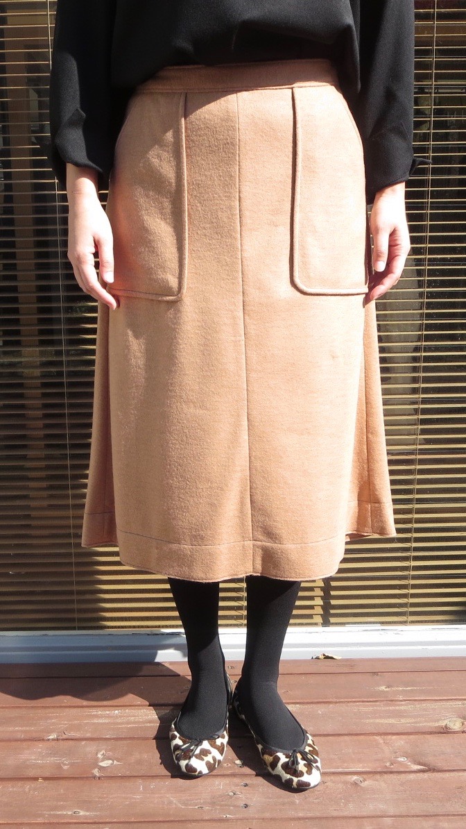 ベイカーパンツを思わせる、大きなポケットが特徴のスカートは、シンプルなデザインのアクセントになっています。バックは、トップスと同様、タックが入っているので、程よいボリュームを加えてくれます。