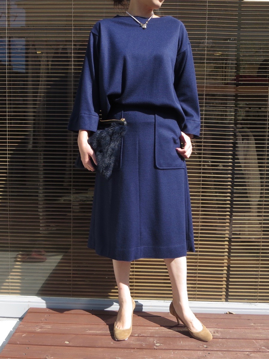 左胸のポケットが唯一のアクセントになっていますが、ドロップショルダー、デコルテが綺麗に見える首元で品のある女性らしさも忘れません。