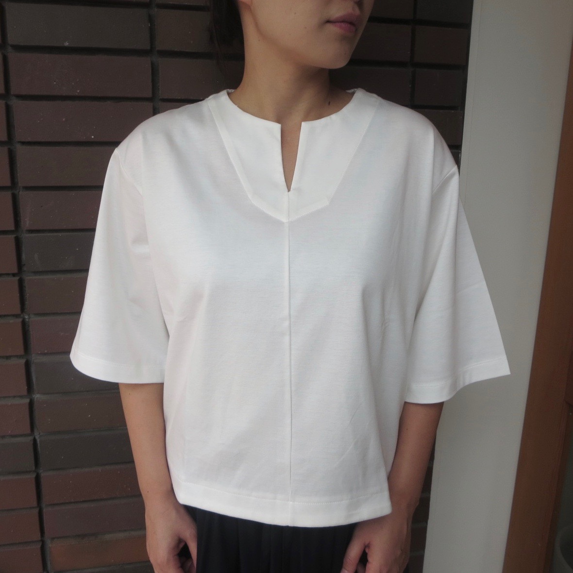五分袖のカットソーは、季節に変わり目に大活躍する一枚。基本の白を押さえておけば安心です。