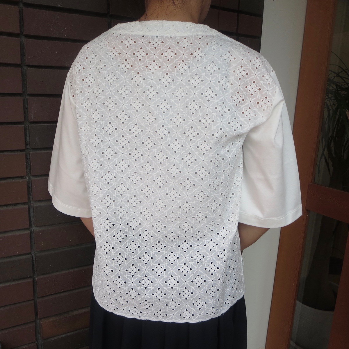 このカットソーの一番の魅力は後ろ姿です。背の部分がレース仕様になっていて、さりげなくお洒落で差をつけられます。