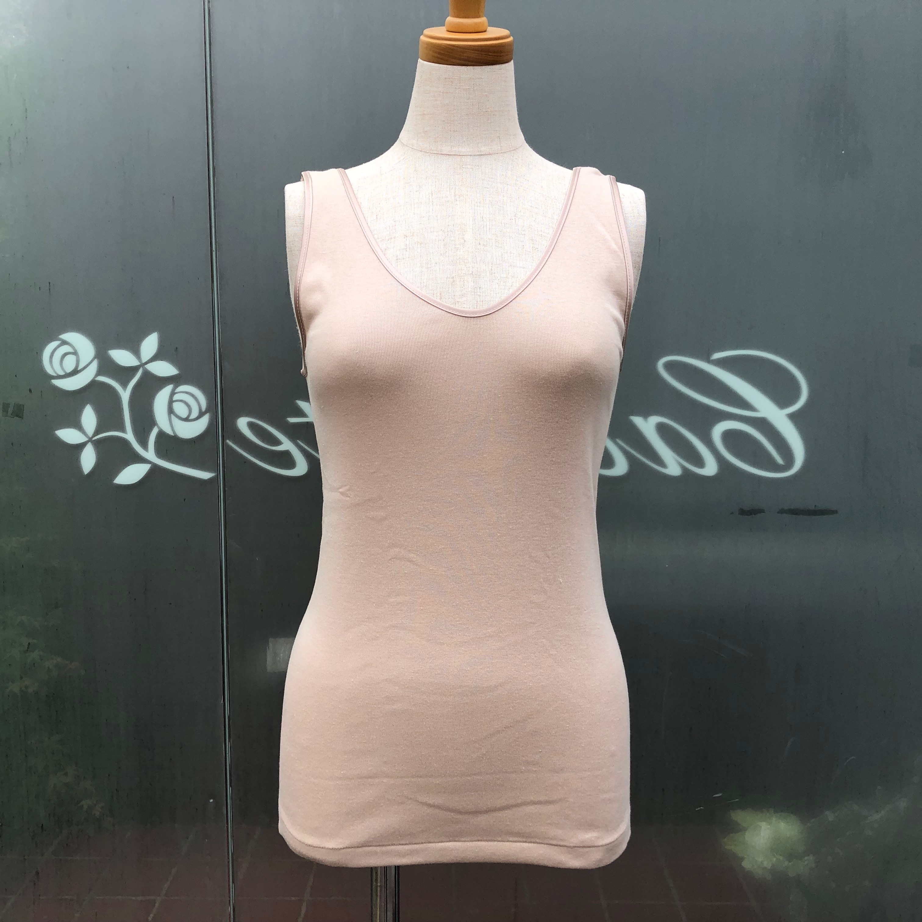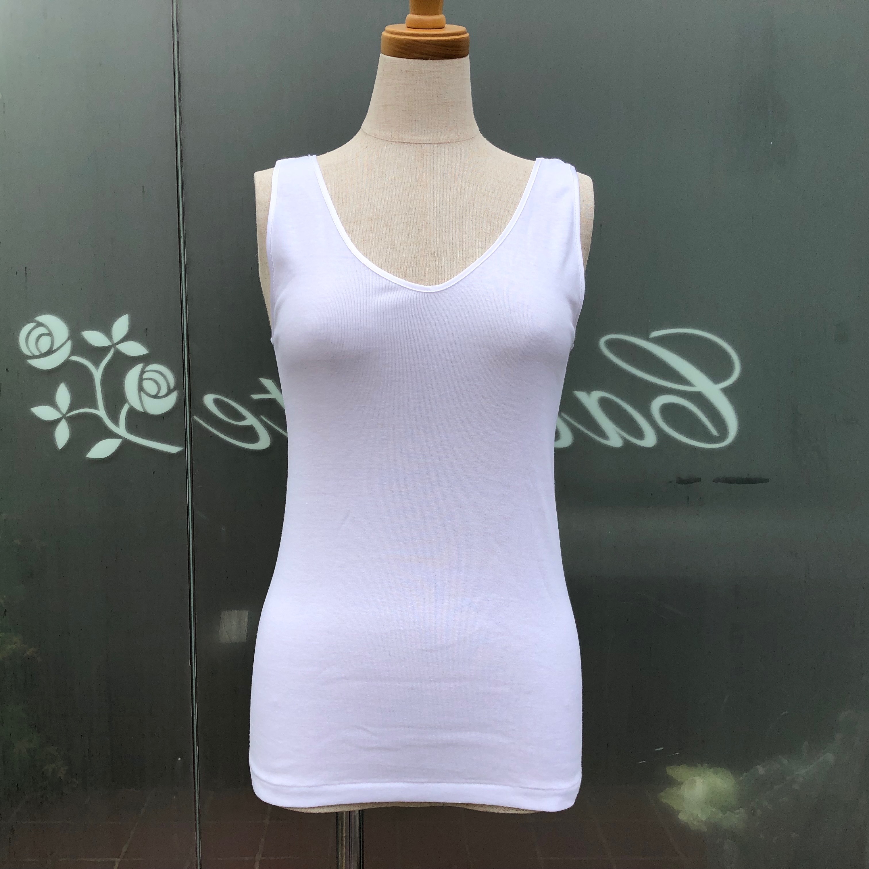 伸縮性のあるリブ素材なので、胸元をしっかり抑えてくれるので健康的な印象です。フィット感もあり丈が長めなので、裾はクシュっとさせたりインしたりと自由自在です。シャツのインナーとして合わせやすいタンクトップです。色違いを一気にご紹介します。
