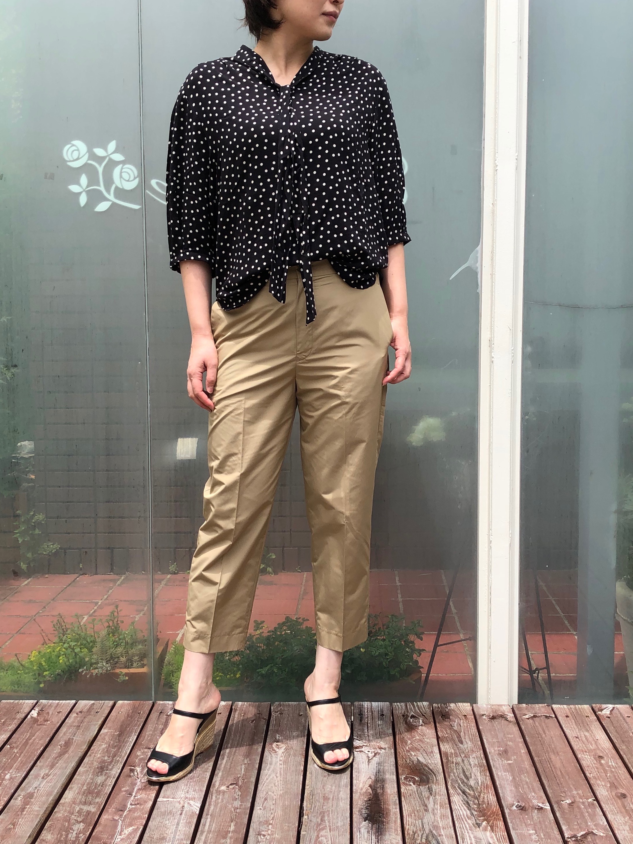ドット柄がトレンドでありながらも、どこかレトロな雰囲気が漂います。綺麗めパンツと合わせてオンオフどちらでも着ていただけるコーディネートに。