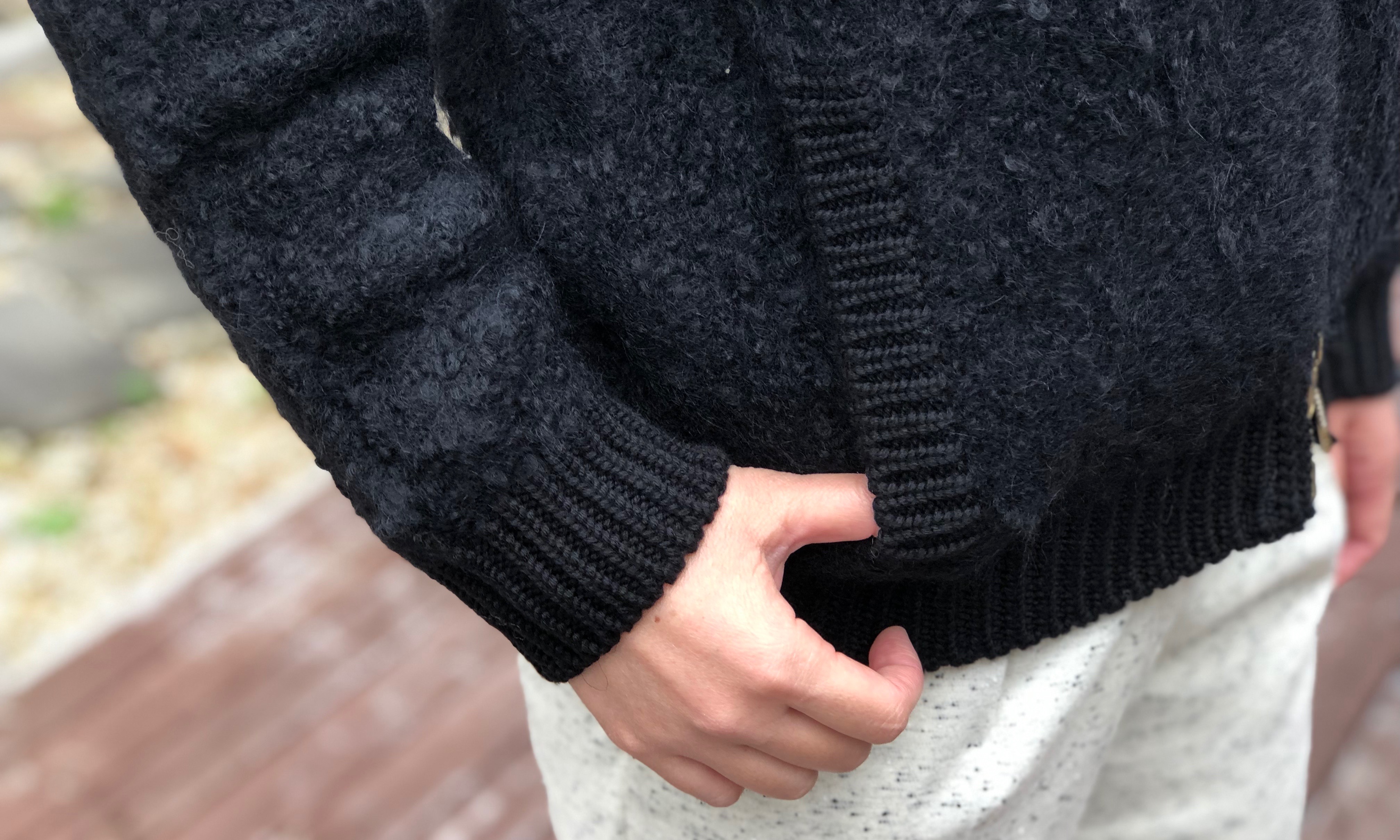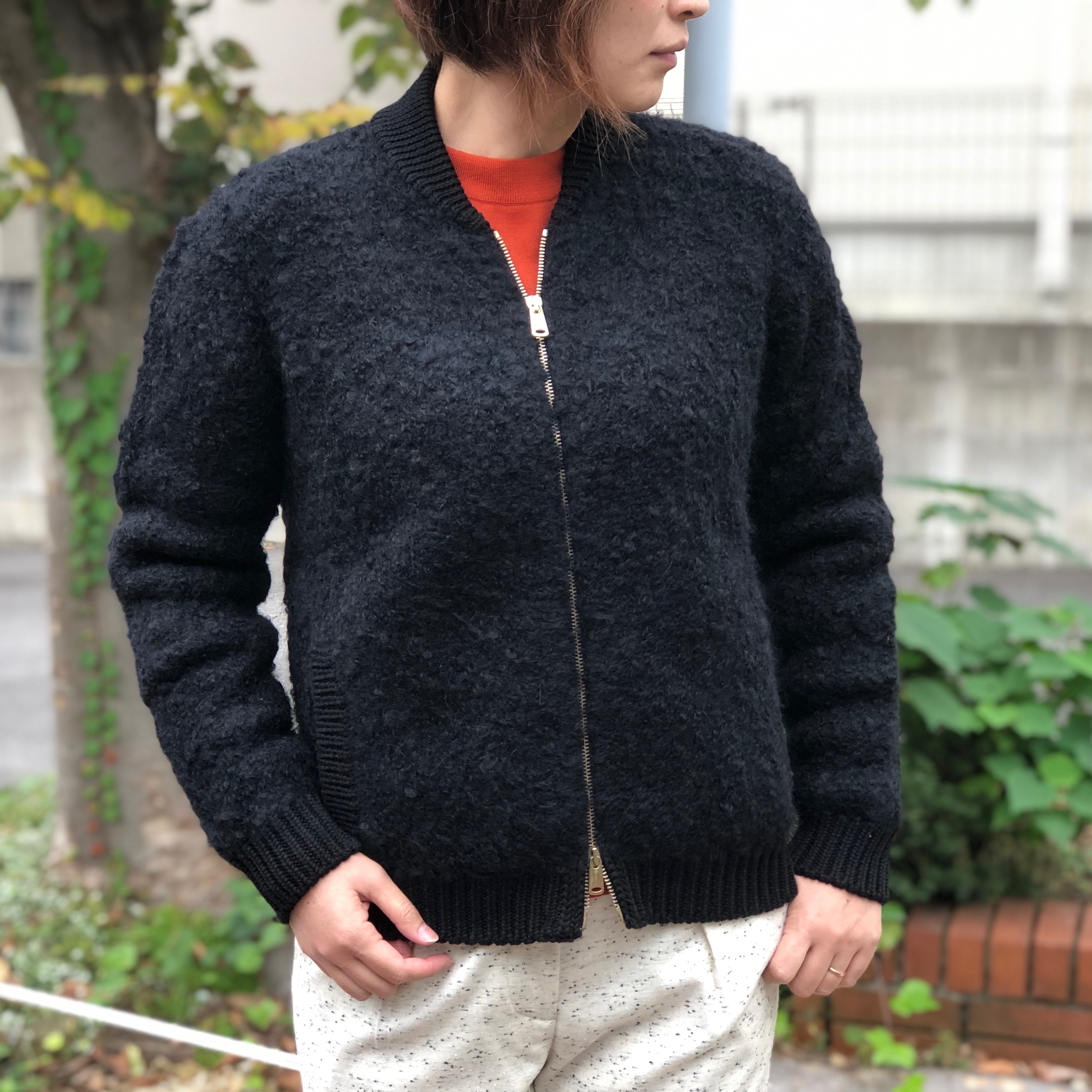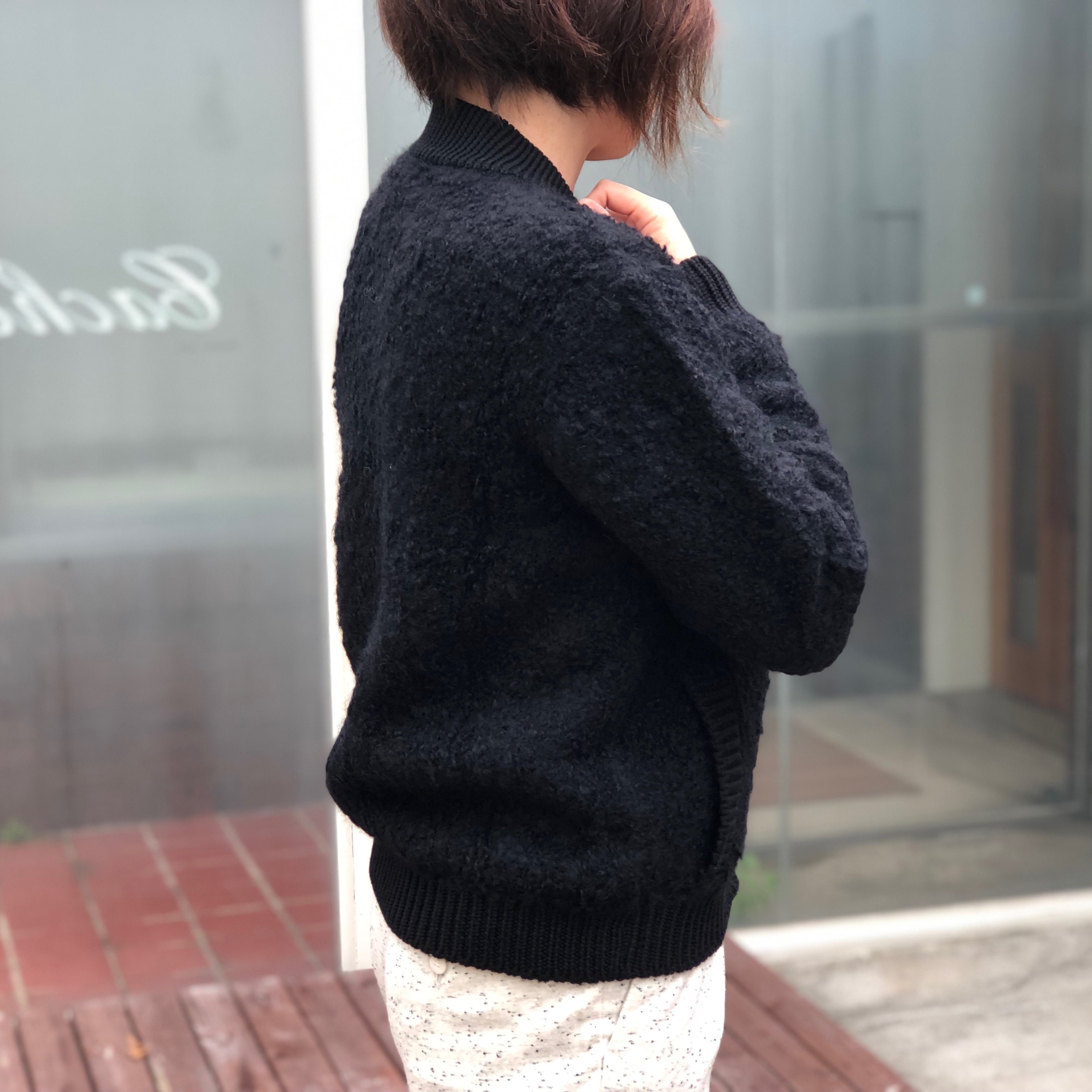 モコモコとした毛羽立ちが特徴的で、襟や袖口などのリブでメリハリをつけながら、メンズっぽさと大人の可愛らしさが共存しています。また圧縮のように目が詰まっているので、風を通しにくく、アウターに近い感覚で着ていただけます。