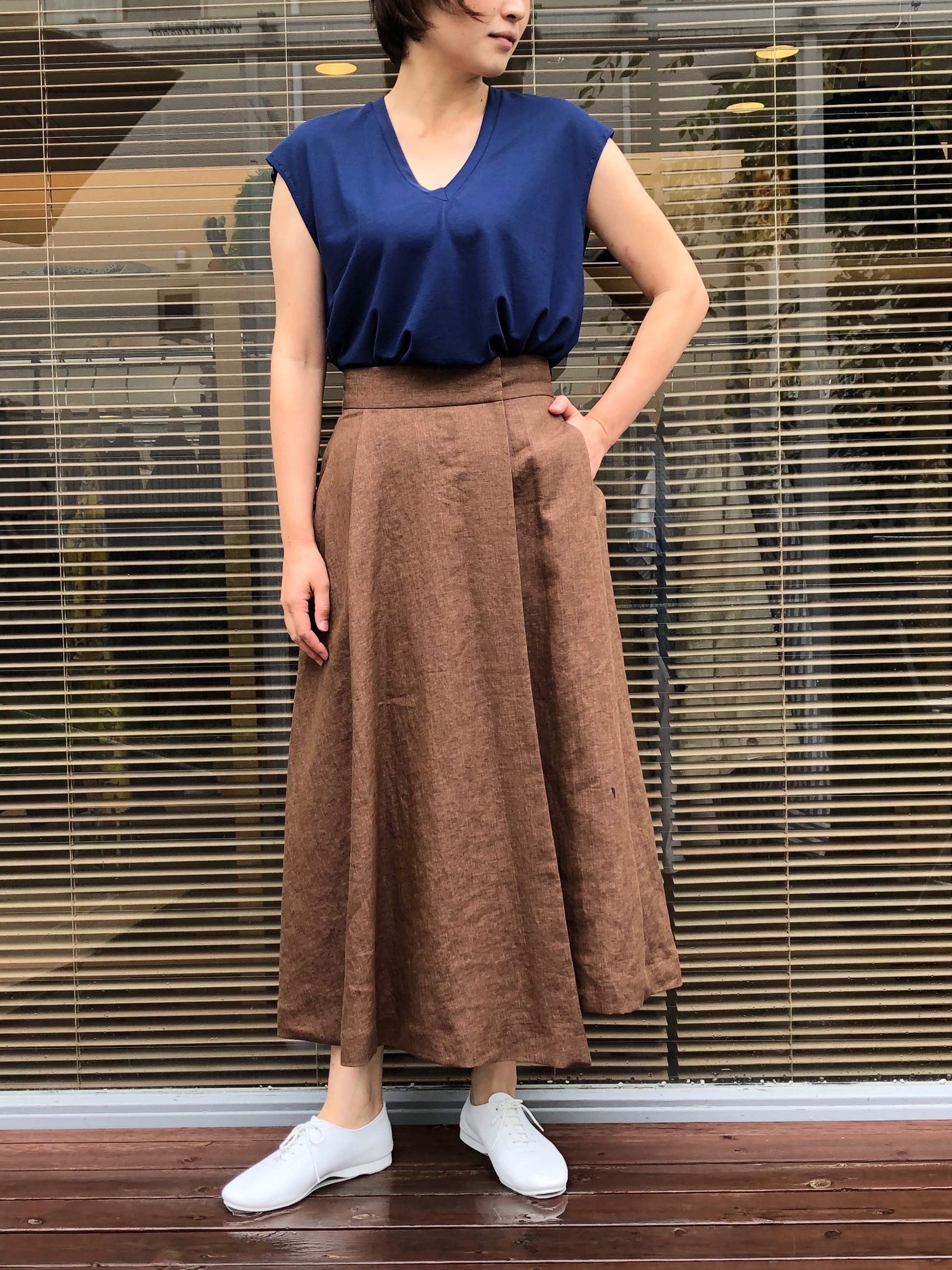 「このスカート好きだなぁ」とピックアップしてくれた巻きスカートに、女性なら白を合わせがちですが、あえてネイビーを合わせて足元の白で爽やかさを出してくれました。