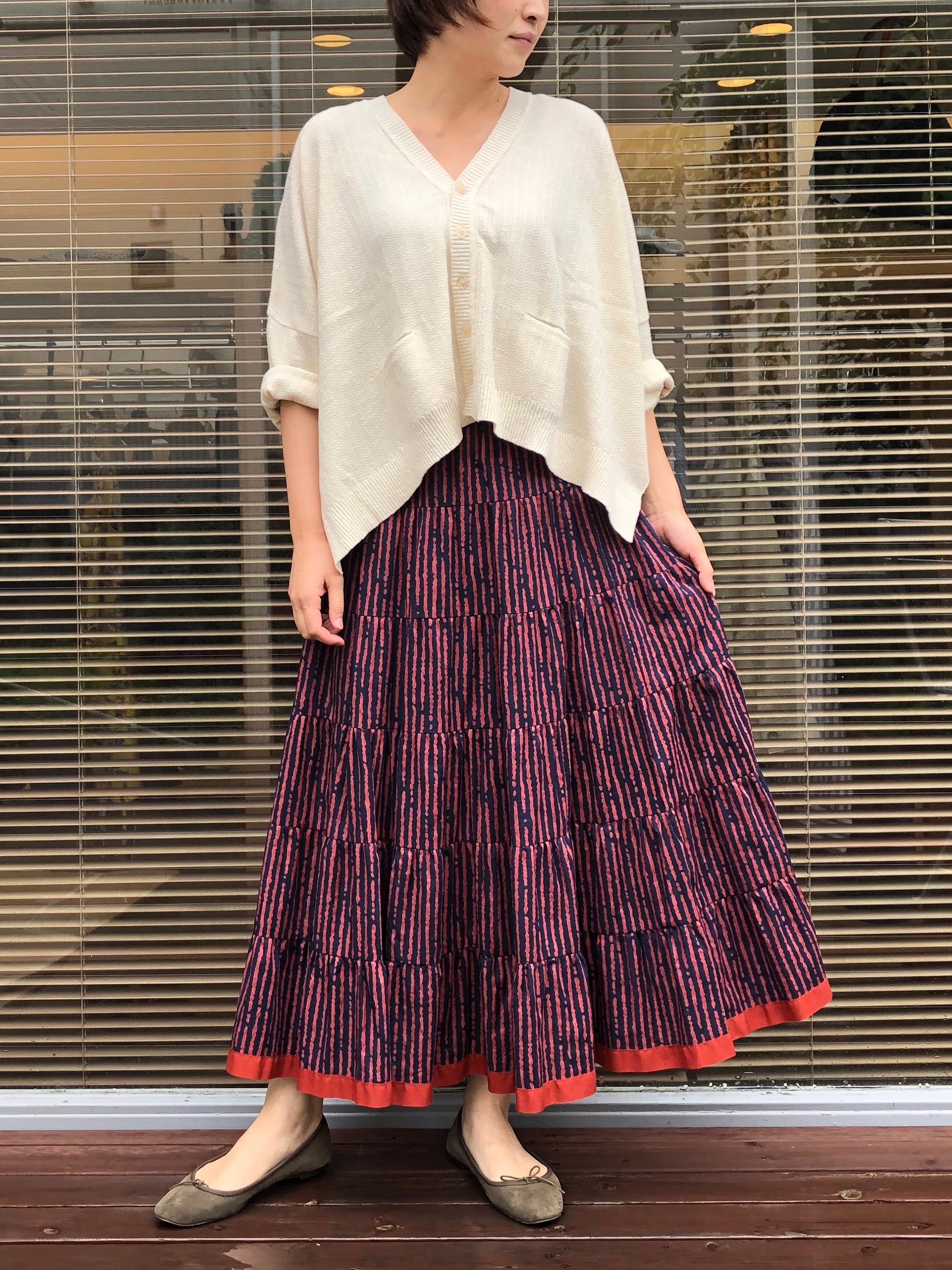 suguruオーナーのブログで、最近フラメンコを鑑賞したとありましたが、そのフラメンコを連想させるような情熱的なスカートに、柔らかい印象のカーディガンを合わせてくれました。
