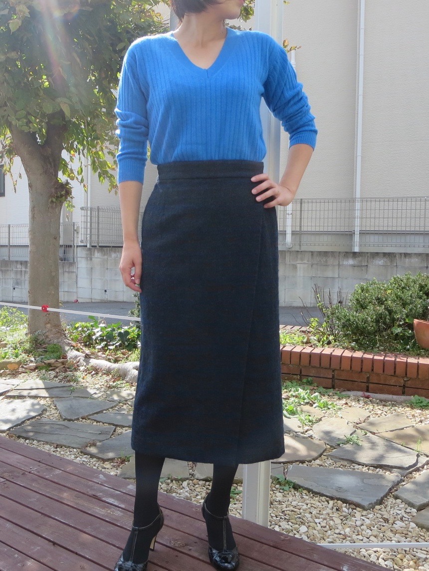 寒色系のブルーは今年注目のカラーで、クールな印象ですが、スカートと組み合わせると甘さが抑えられてクールビューティなスタイルを楽しめます。