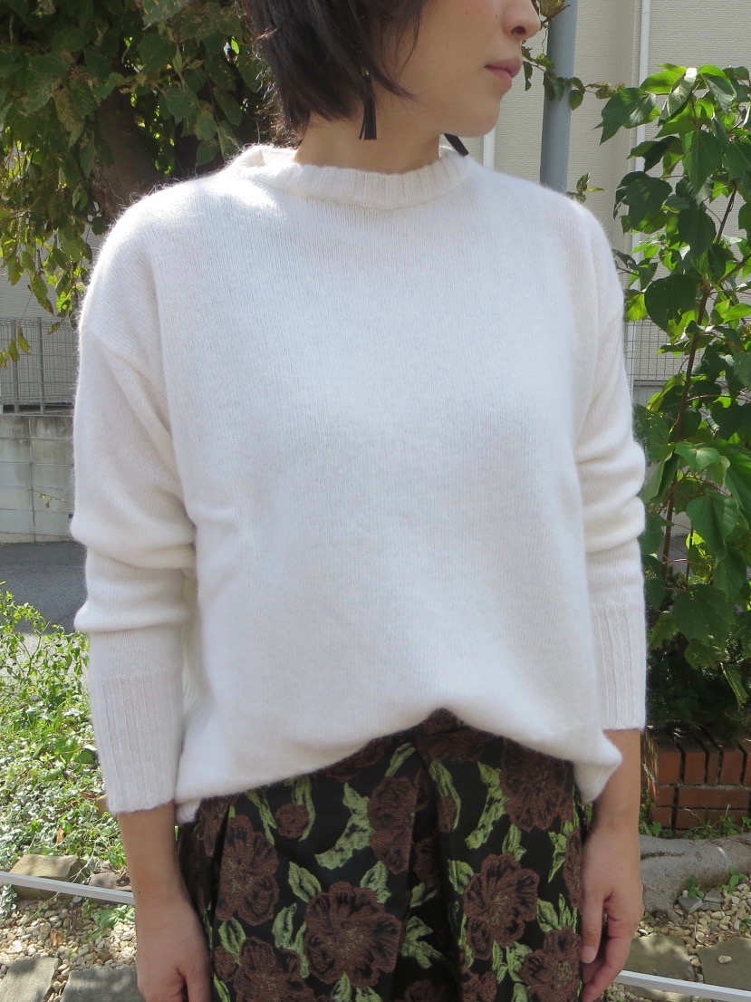 アンゴラ混の毛足の長い素材と雪のような白で、こんなに大人の可愛らしさを感じられるニットには、なかなか出会えません。