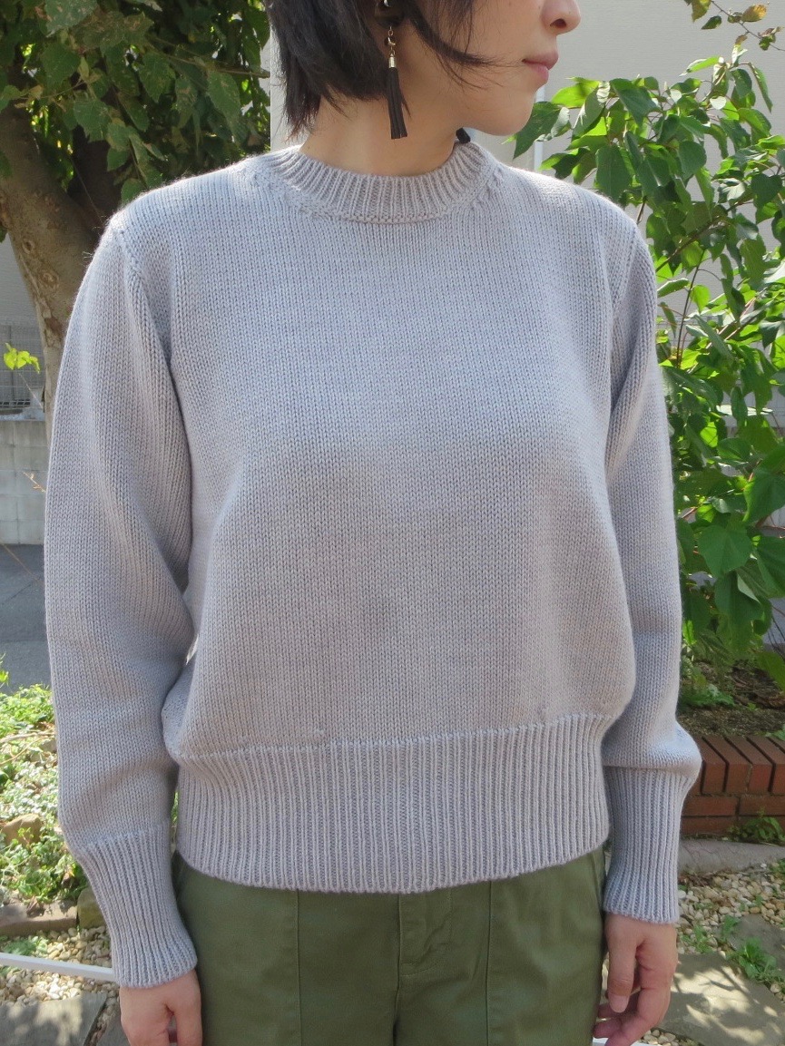 去年も好評だったミドルゲージクルーネックニットが今年も登場です。丈が短めなので、ボリュームのあるボトムと相性が良く、今年のトレンドでもあるスカートとも是非合わせていただきたいです。
