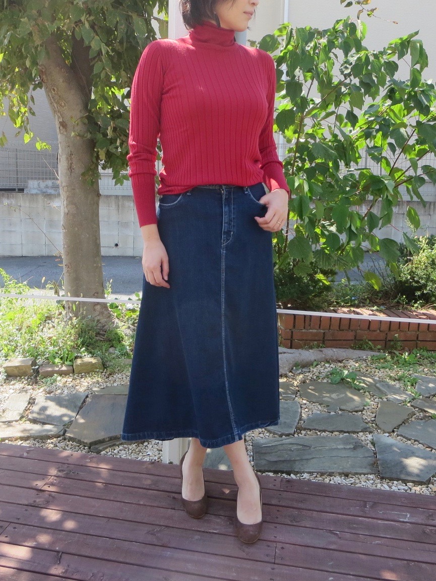 こちらもハイゲージのリブ編みタートルネックニット。太めのリブで一枚でも様になりますし、インナー使いとしても使いやすい薄さです。