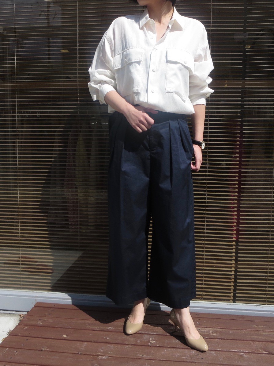 衿はクラシックなタイプで、やや大きめなのが可愛らしく、ぜひ襟元の釦を少し開けて着てください。ボトムを選ばない万能シルエットですし、オンオフどちらにも対応していただけます。
