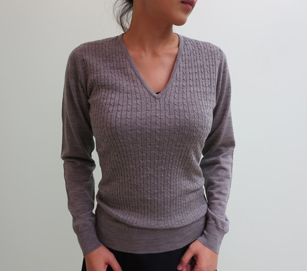 こちらはケーブル編みのVネックニット。ケーブルの模様が、何とも正統派の雰囲気で、今シーズンのトレンドにもピッタリアイテムです。ふんわりスカートや柄パンツなどに合わせれば、グッとお洒落度UP!