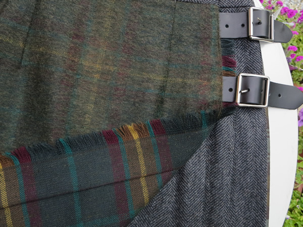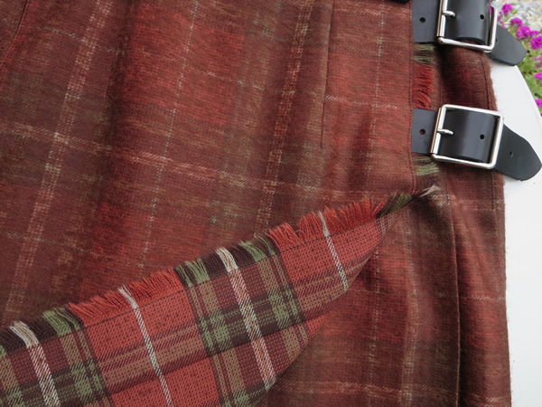3種類の生地を使用したクレージーパターンのラップスカート。表地は、しっかりしたウールの生地で滑らかな肌触り。めくると裏地はチェック柄になっています。その下には、ヘリンボーン柄。バックスタイルは、また違ったチェック柄で、なんとも素敵な1枚に仕立てられています。穿くだけで、お洒落感満点です!