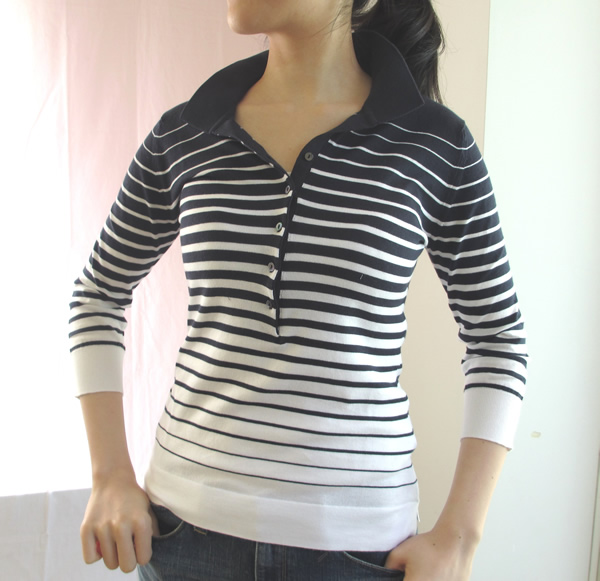 上と同じパターンのボーダー柄で、前立て部分にも色が効いているのでスッキリ見えます。現代的でエレガントな雰囲気ですね。