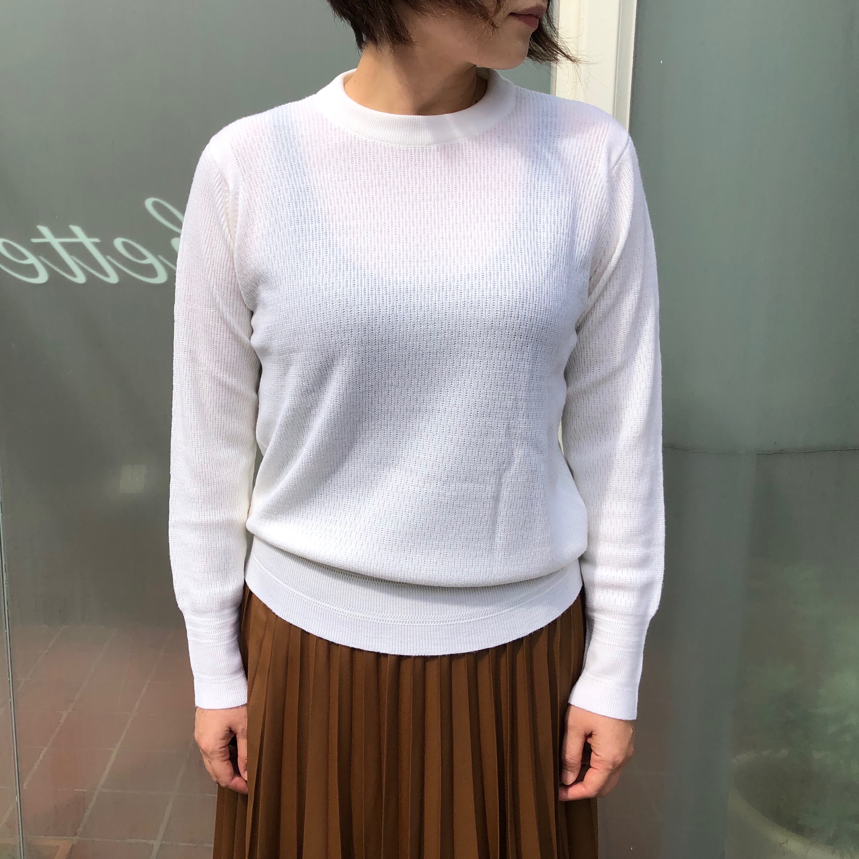 もう定番にもなっているクレリックポロです。体のラインを拾いすぎない絶妙なサイズ感で、上品なニットに仕上がっています。