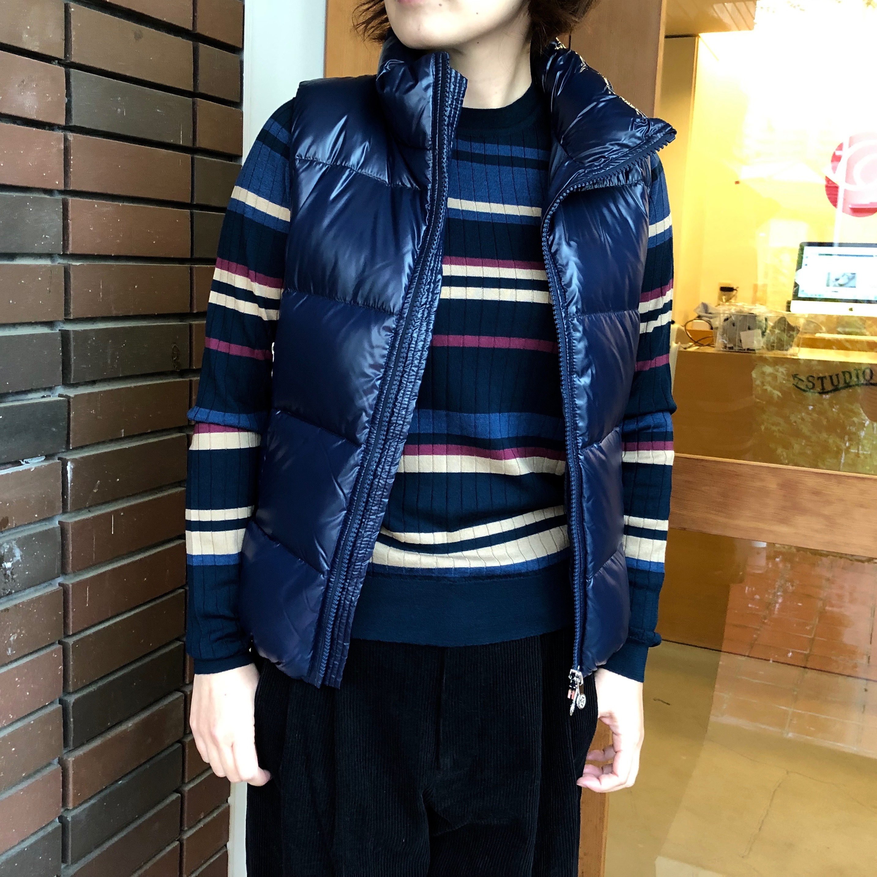 これからの季節は、アウターから覗くボーダーニットはアクセントにもなります。今回はメンズの『PYRENEX』のベストを拝借して。ちなみに、レディースの『PYRENEX』は来週あたりから、少しずつ入荷予定なので、楽しみにしていてください。