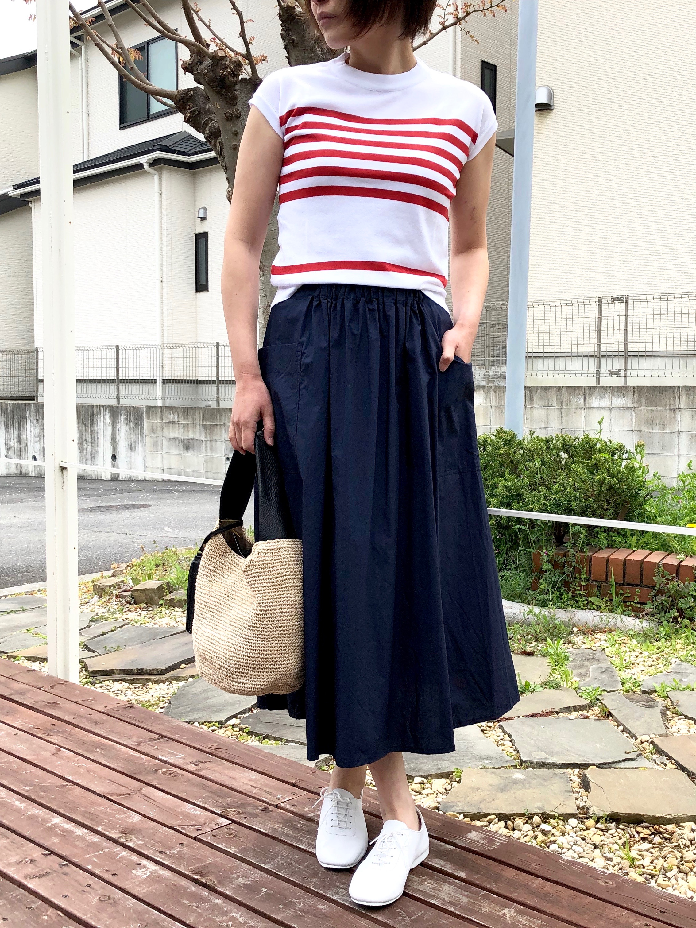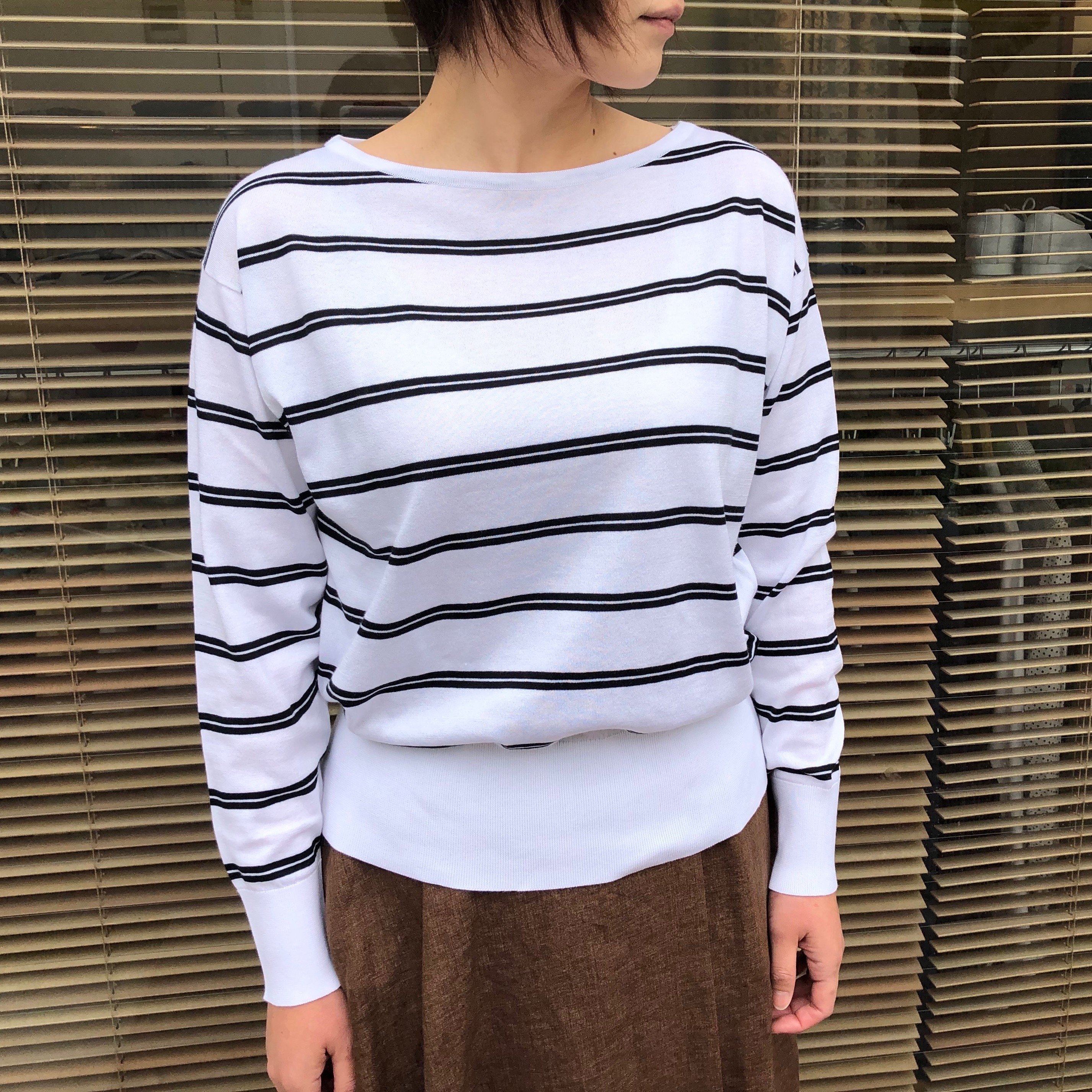 こちらも日本別注のボーダーニット。ボーダーの配置が面白く一枚で様になるニットに仕上がっています。程よいフィット感で、ボリュームのあるボトムと合わせやすく、今回はスカートとコーディネート。爽やかな印象になりました。