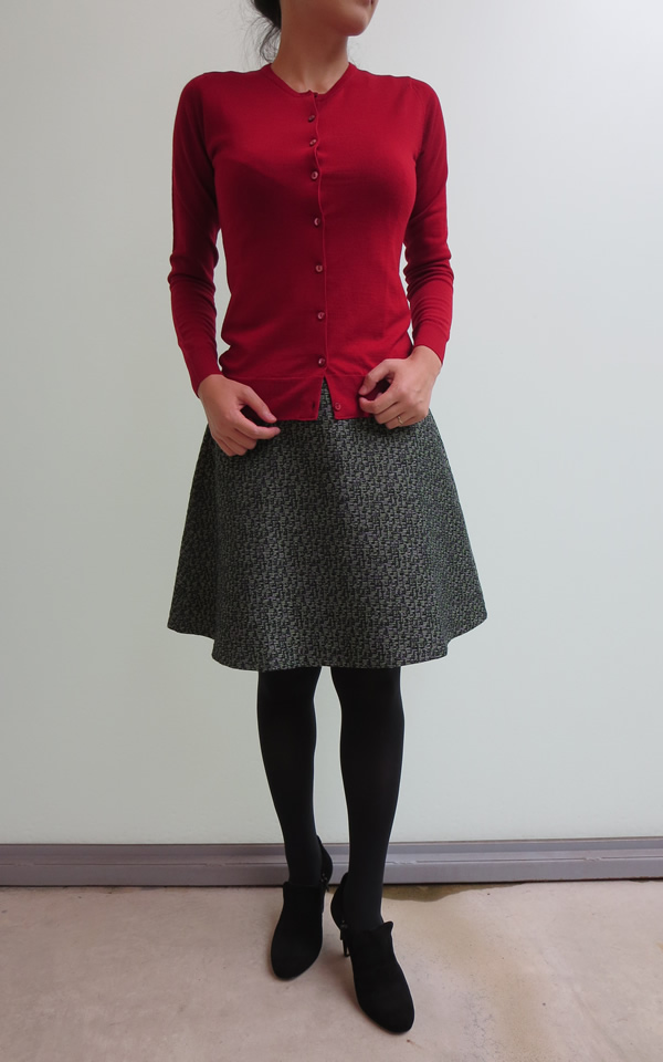 華やかで上品なスメドレーのキャップスリーブニットに、キレイ目なスカートを合わせてみました。肩に巻いているのは、定番のクルーネックカーディガン。アンサンブルのインナーとしても、使えますので、セットで揃えられることをお勧めしています。