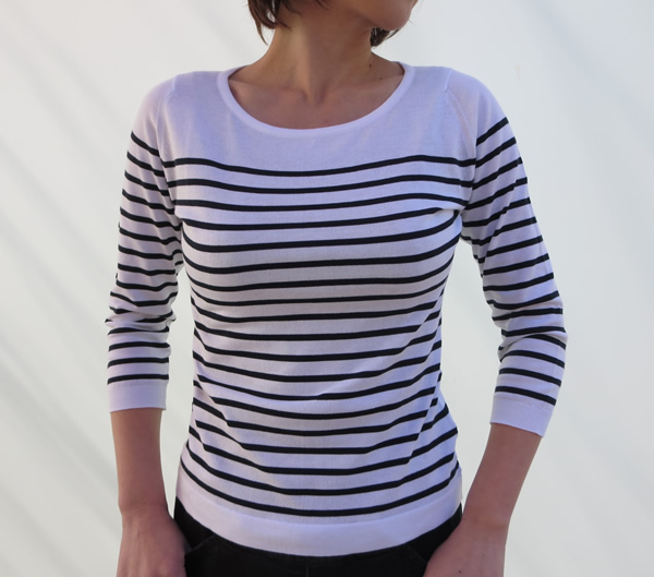 こちらは、ホワイト×ネイビー。オールマイティーに着れるネイビーは、1枚あると重宝しそうです。