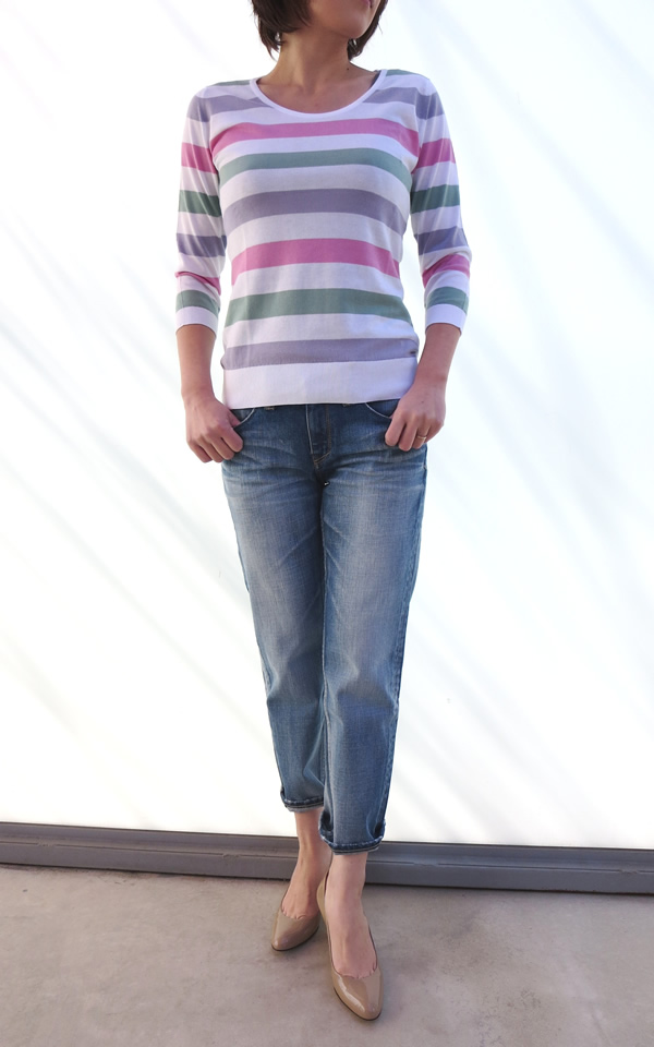 こちらは、春らしいカラーボーダーニット。クリーンなホワイト地に洗練されたペールトーンの配色が顔色をキレイに見せてくれます!素材は、勿論シ―アイランドコットンを使用し、暑い夏にも涼しげに気持ち良く着て頂けます。