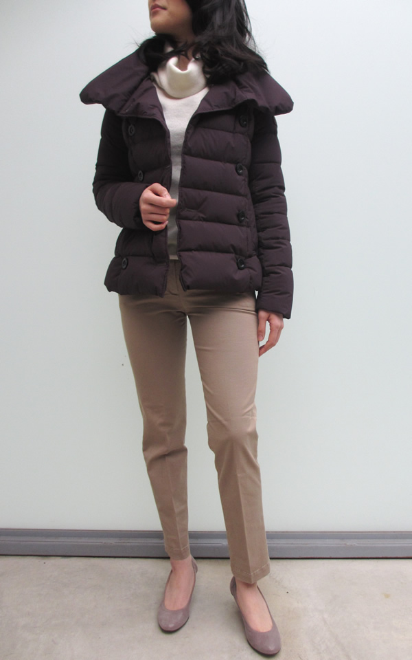 こちらは、今シーズン大人気の“TATRAS”のショートダウンとのコーディネイト。深みのある色やスッキリとしたシルエットは、とてもフェミニンな雰囲気です。軽くて暖かいダウンは、これから使えますよ!中の白ニットも春先まで活躍しそうです。