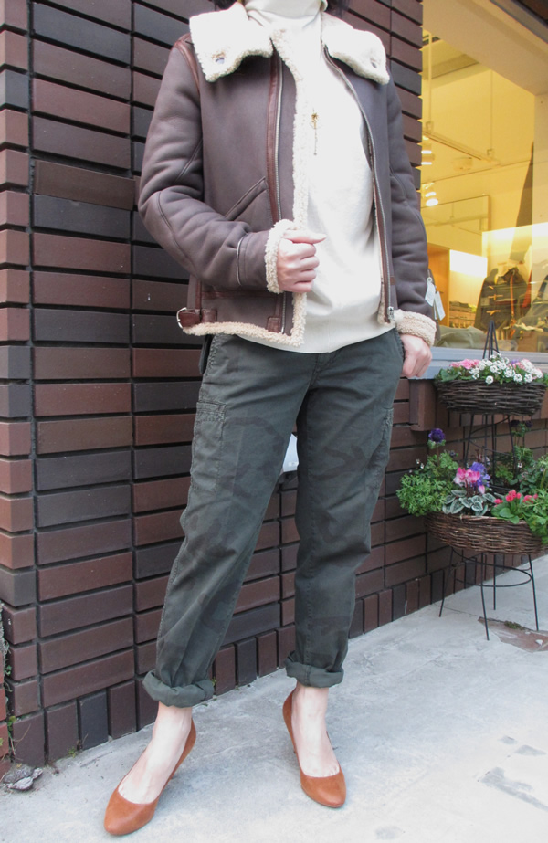 こちらは、上にムートンのアウターを合わせてみました。今からの寒い季節には、とても使えそうですよ。丈もボトムを選ばない長さです。カーゴパンツと合わせるとグッと大人の雰囲気です。