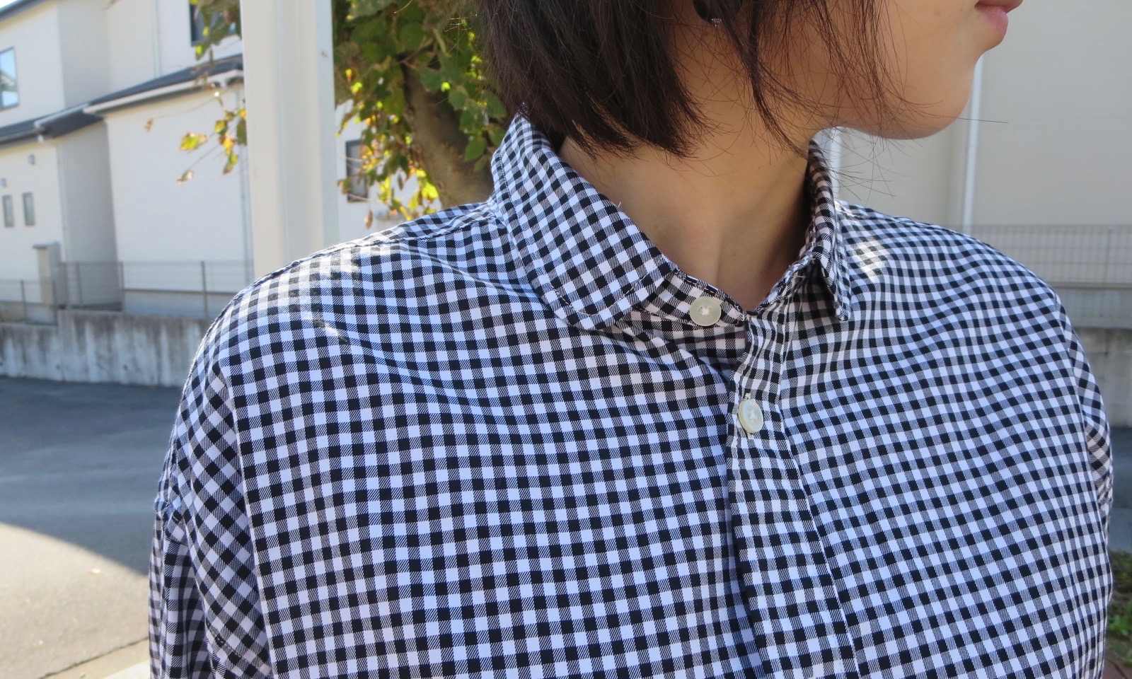 何と言っても可愛らしいのは、丸襟とチラッと覗くドット柄。またギャザーが入ることによって全体的に柔らかな印象に仕上げてくれています。