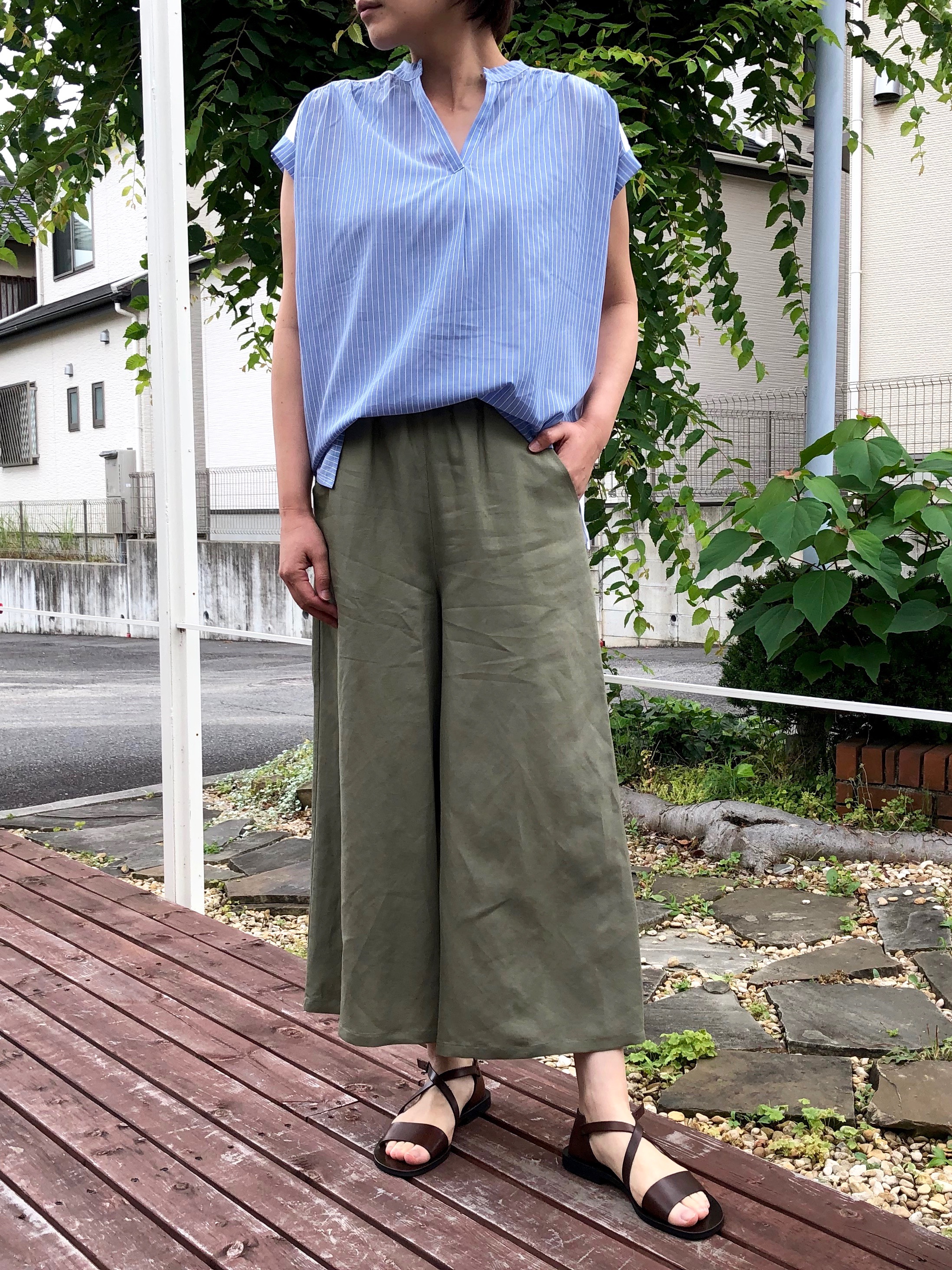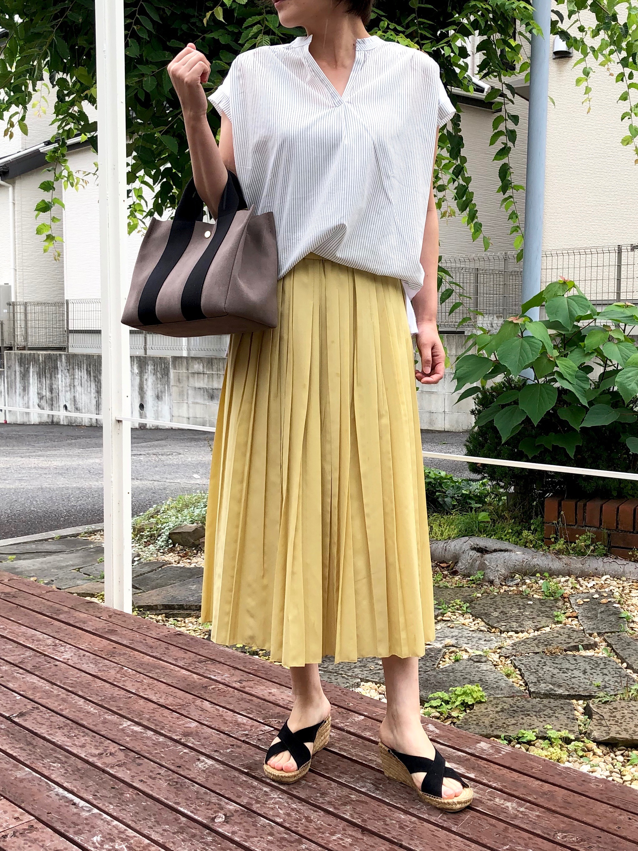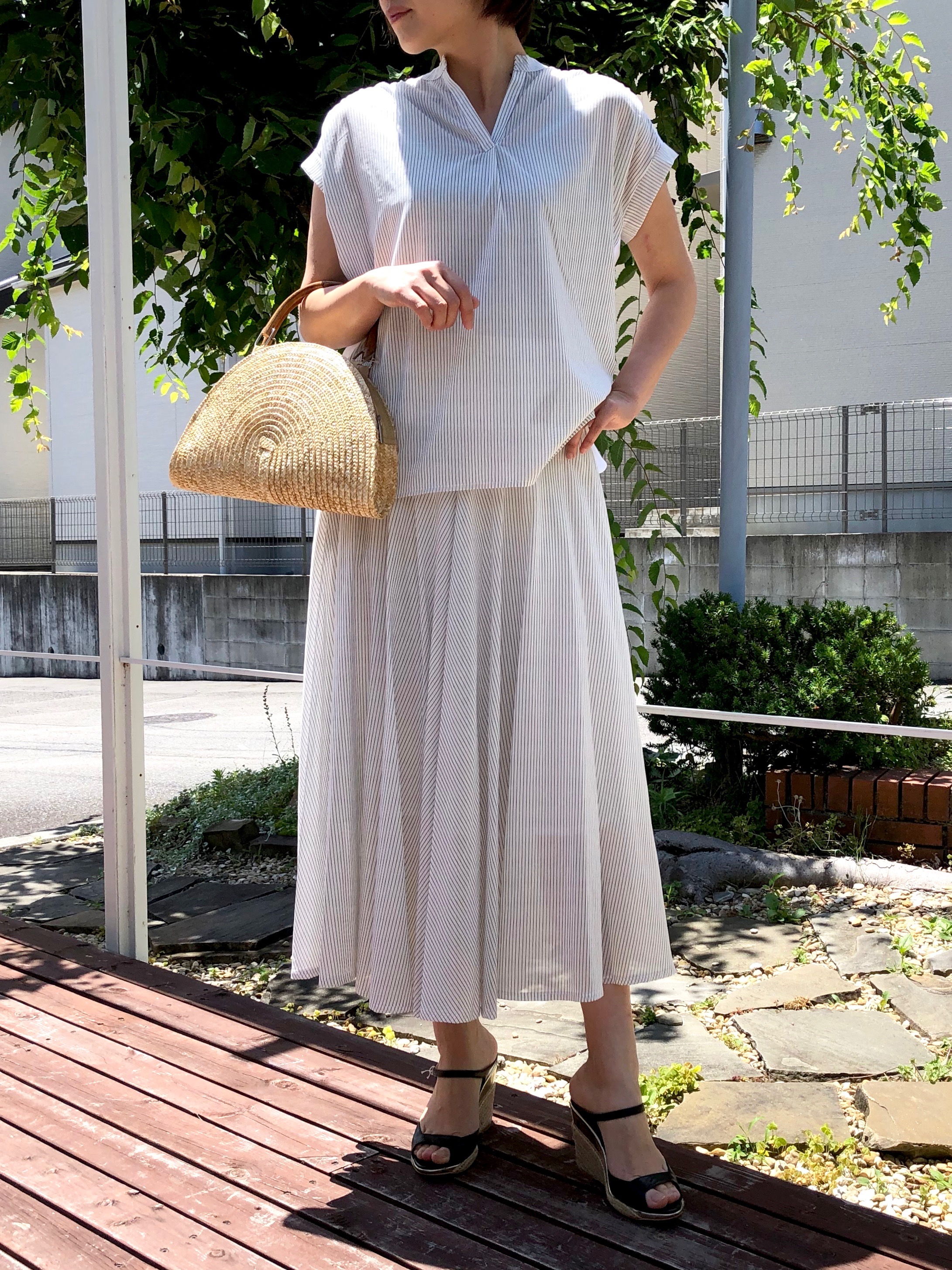 この写真だと、ストライプがうっすらとしか分からないので、ぜひ写真をクリックしてご覧ください。白ベースなので、どんな色のトップスとも好相性で、夏らしいッコーディネートを楽しめます。今回は以前ご紹介したブラウスと同シリーズなので、セットアップで着てみました。