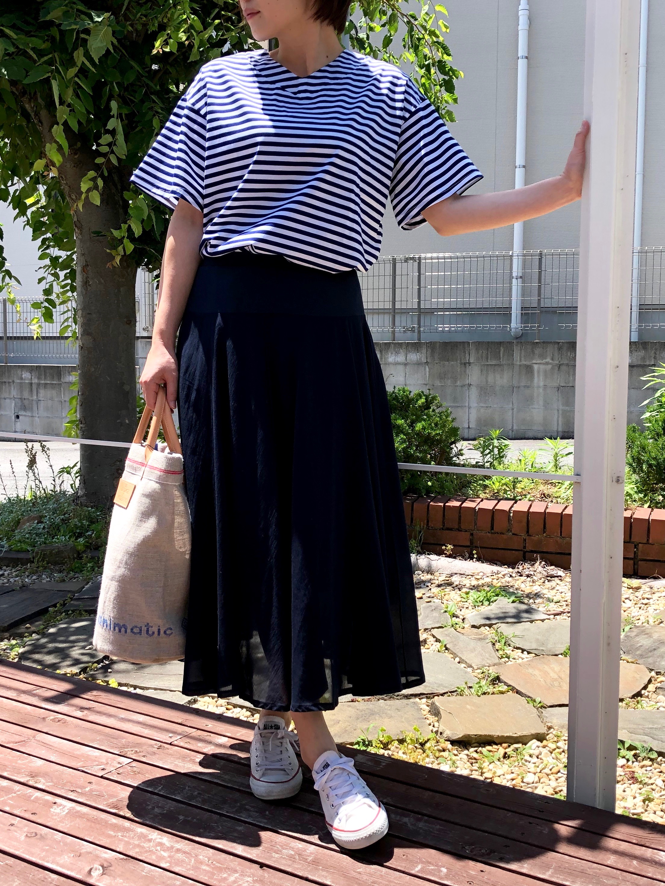 カットソー&スニーカーでカジュアルに着こなしても、いつものパンツをスカートに穿き替えるだけで、ぐっと女性らしく優しいスタイリングに生まれ変わります。