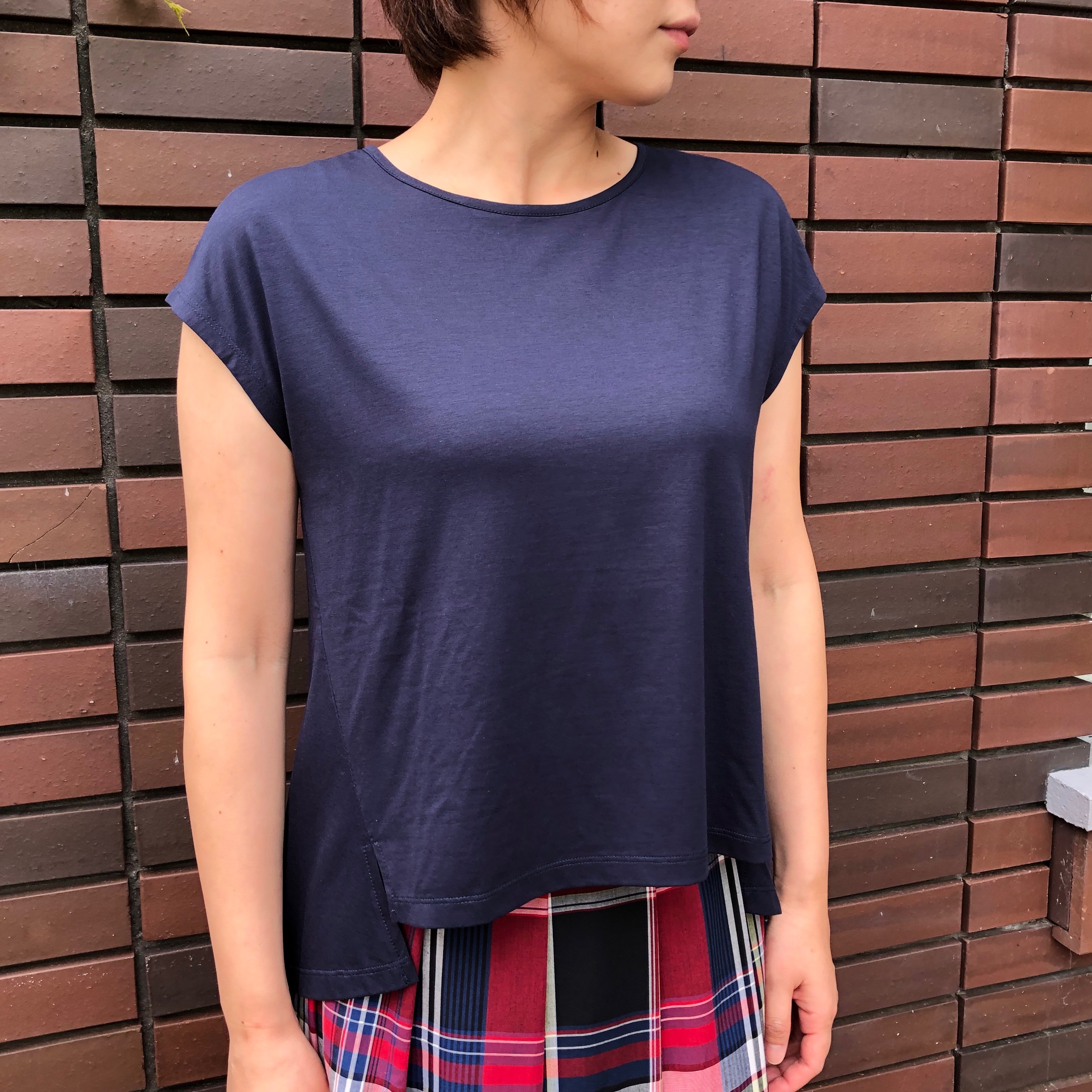 ゆったりとしたサイズ感で、程よく透け感のある素材で、涼しげな一枚です。首元も開きすぎないVラインですっきりとしています。