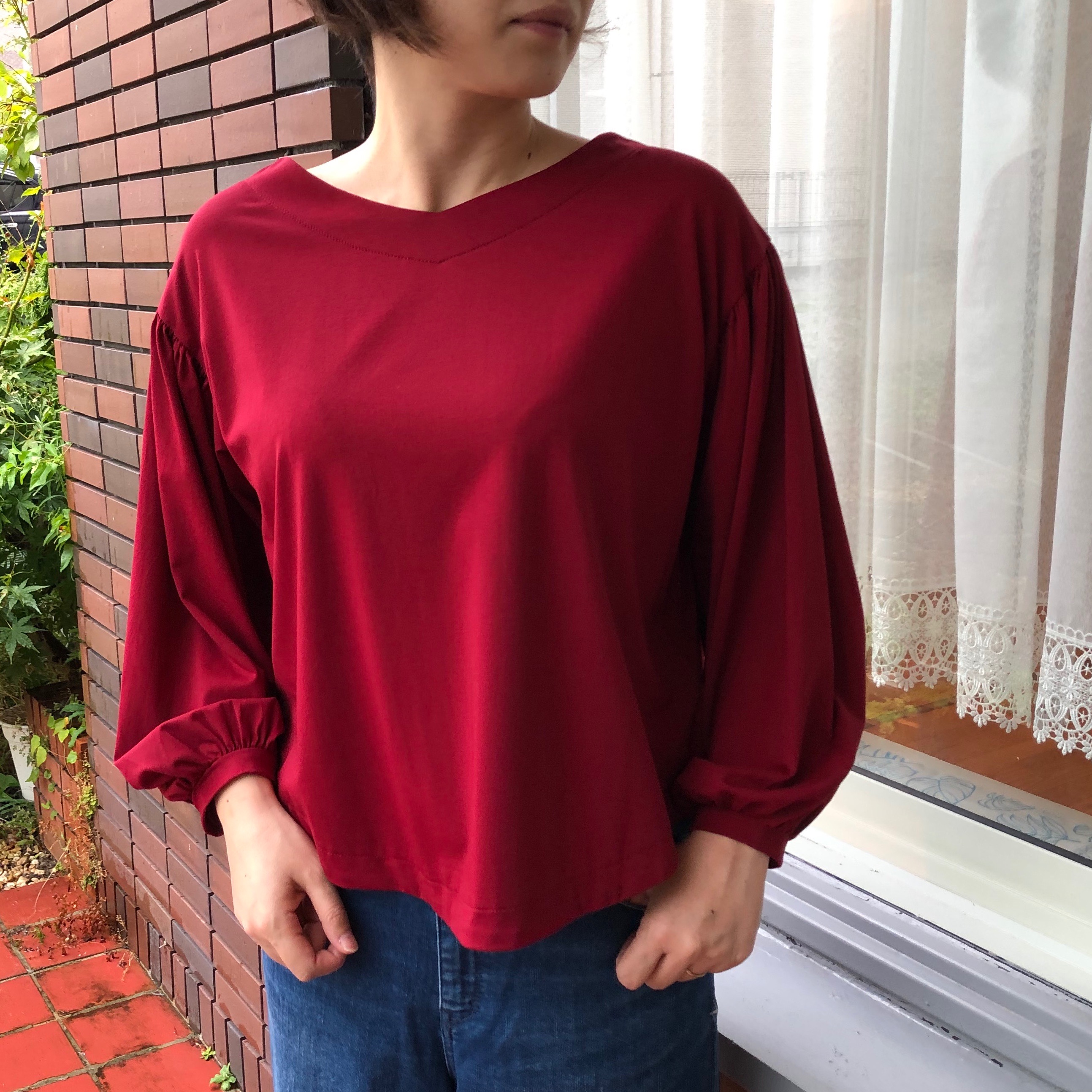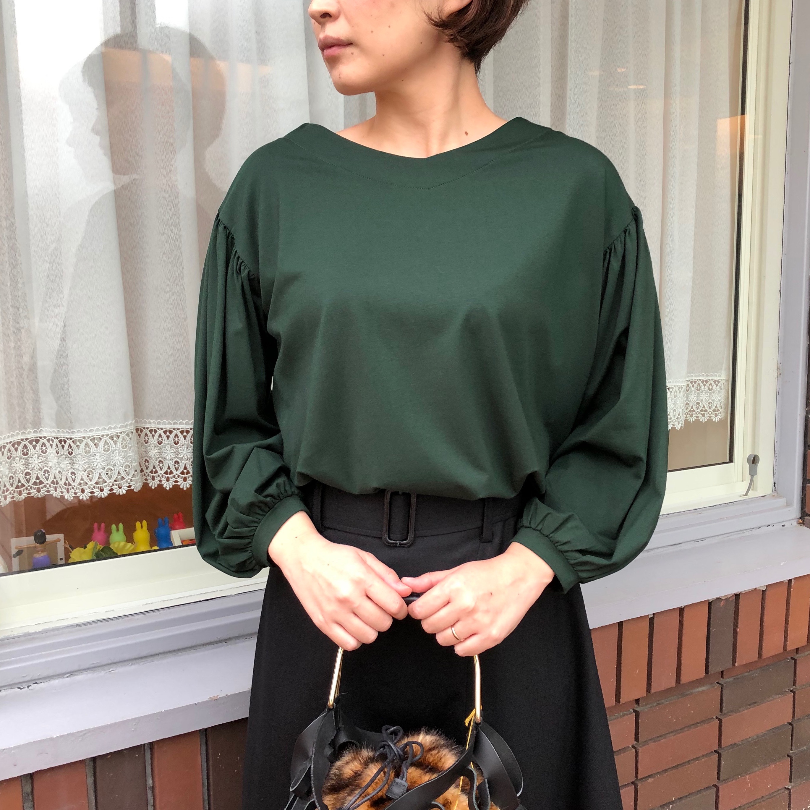 色違いのグリーンも深みがあります。落ちた肩と袖にギャザーをたくさん寄せているので、カットソーながらエレガントな雰囲気が漂います。
