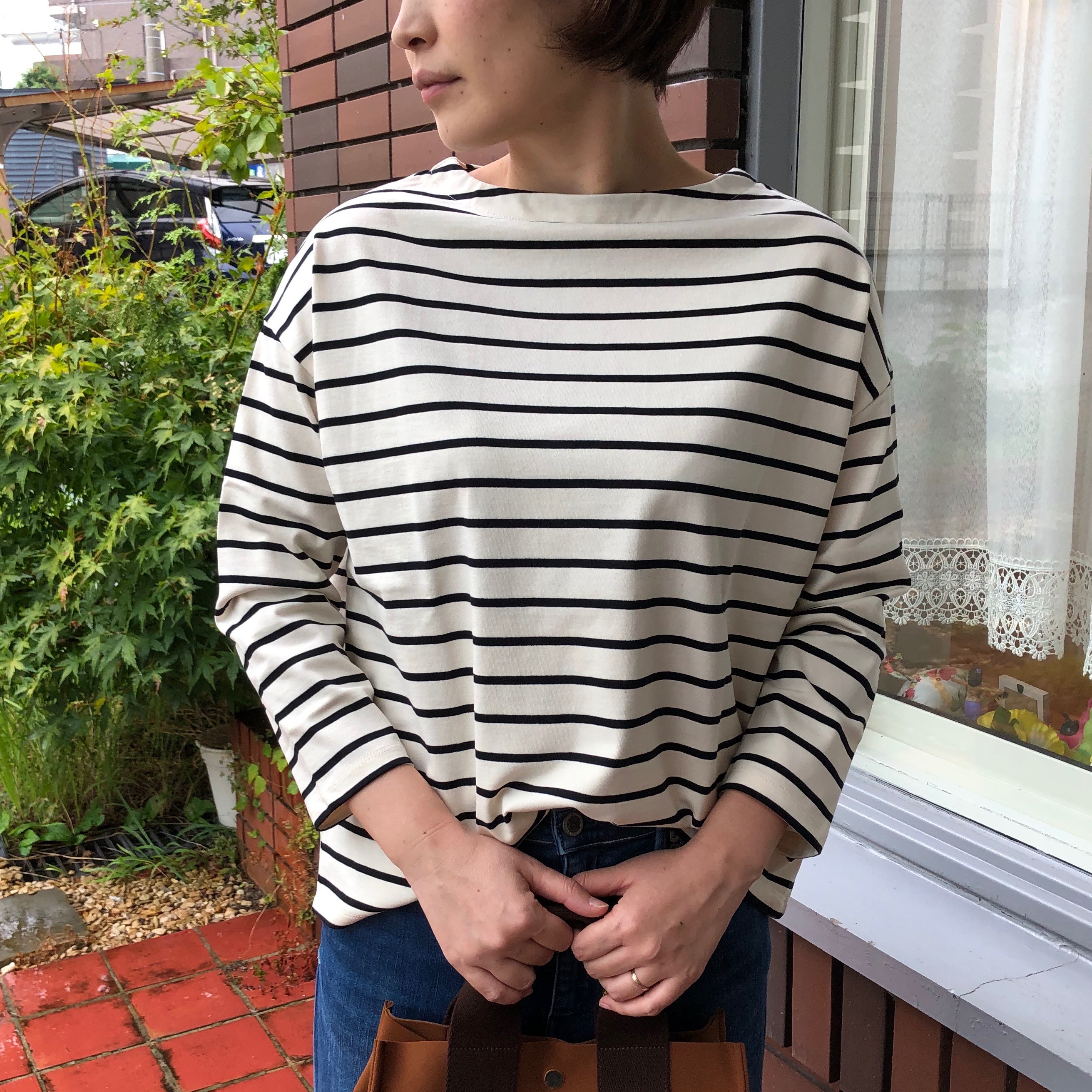 みんな大好き、ボーダーカットソーです。首に沿うようなボートネックで、立体感が出るので顔周りをすっきり見せる効果があります。ドロップショルダーで、全体的にゆったりとしたシルエットで、一枚で様になるカットソーです。