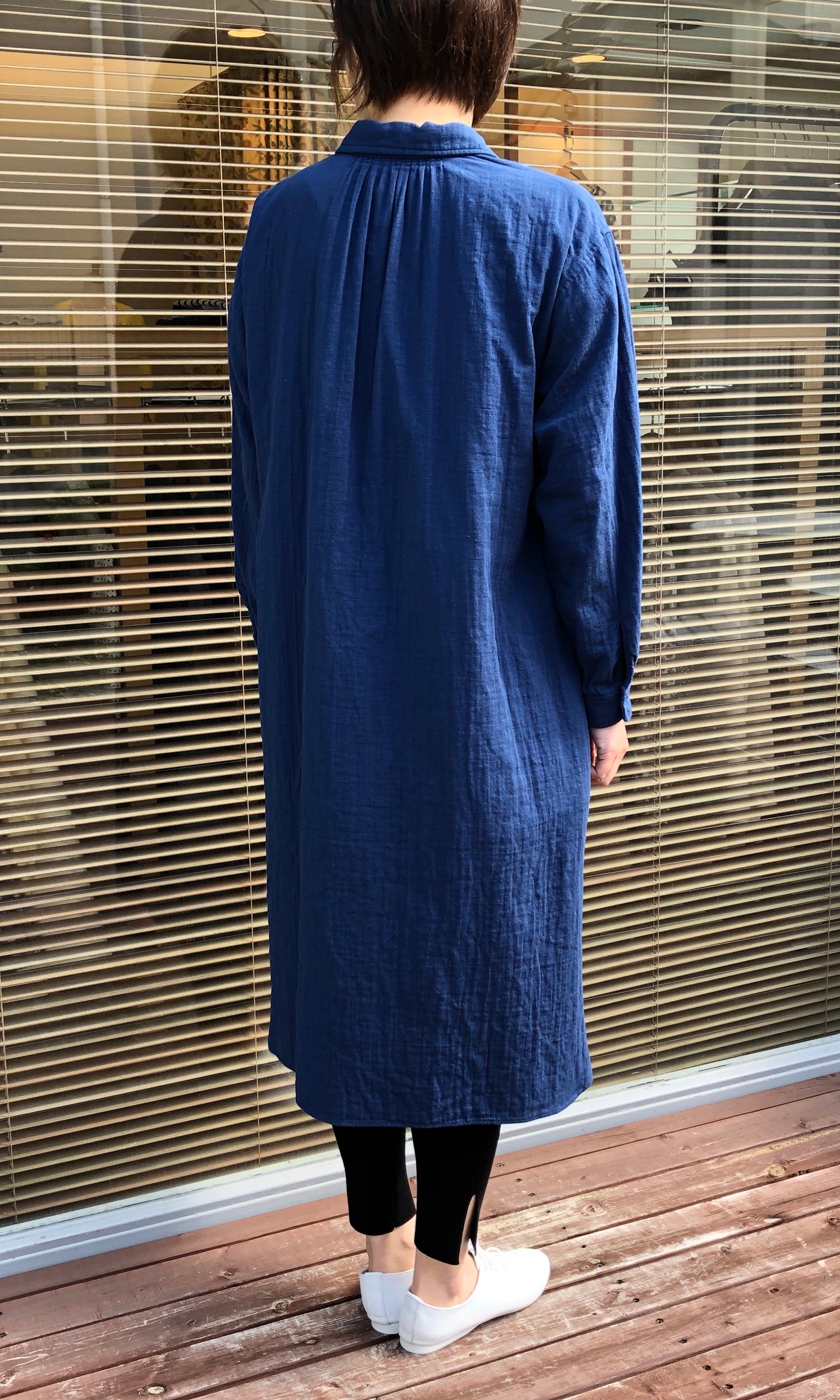 こちらは、お尻がすっぽりと隠れるくらいの着丈で、どんな身長の方にも合わせやすくなっています。ノーカラーで首回りもすっきりとしていて、羽織った時の前開きのバランスがとても綺麗です。