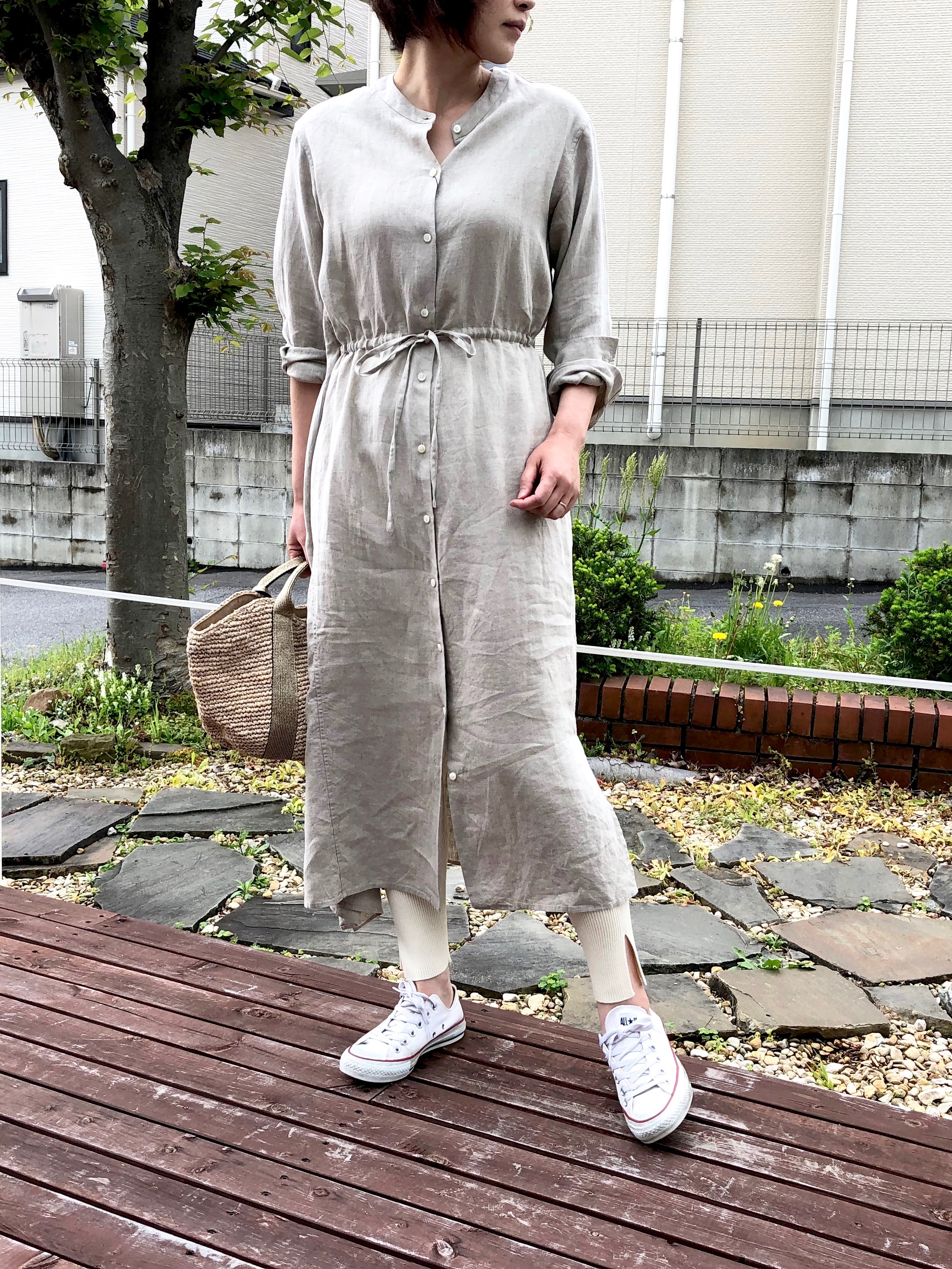 合わせたワンピースは『heliopole』のもの。リネン素材で涼し気で、前開きなので羽織りとしてもレイヤードスタイルを楽しめます。