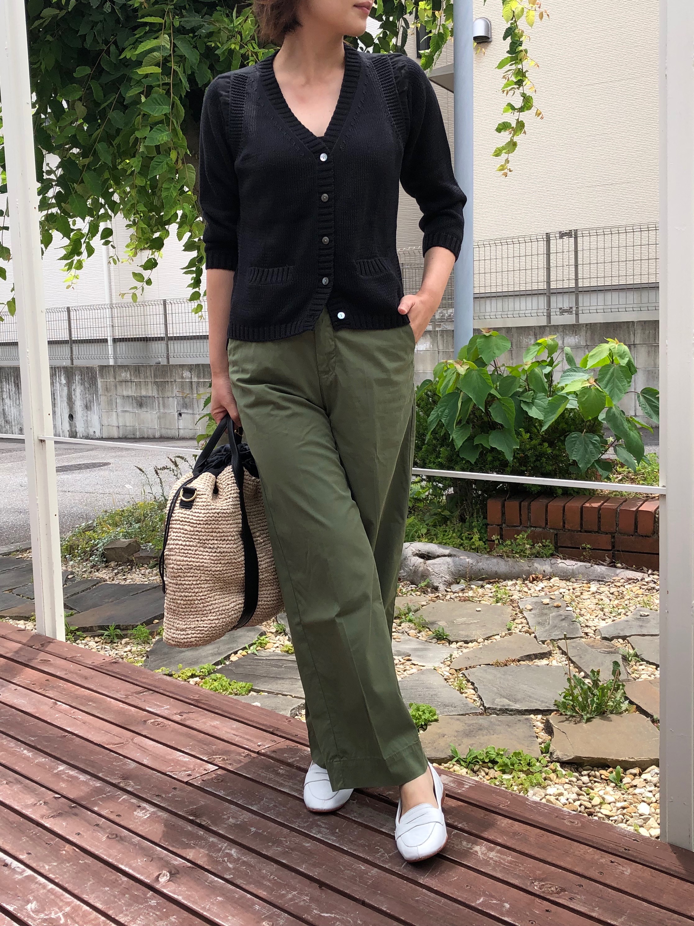 派手すぎないグリーンが、白のパンツによく映えます。意外にもどんな色味にもマッチし、コーディネートが楽しくなってきます。