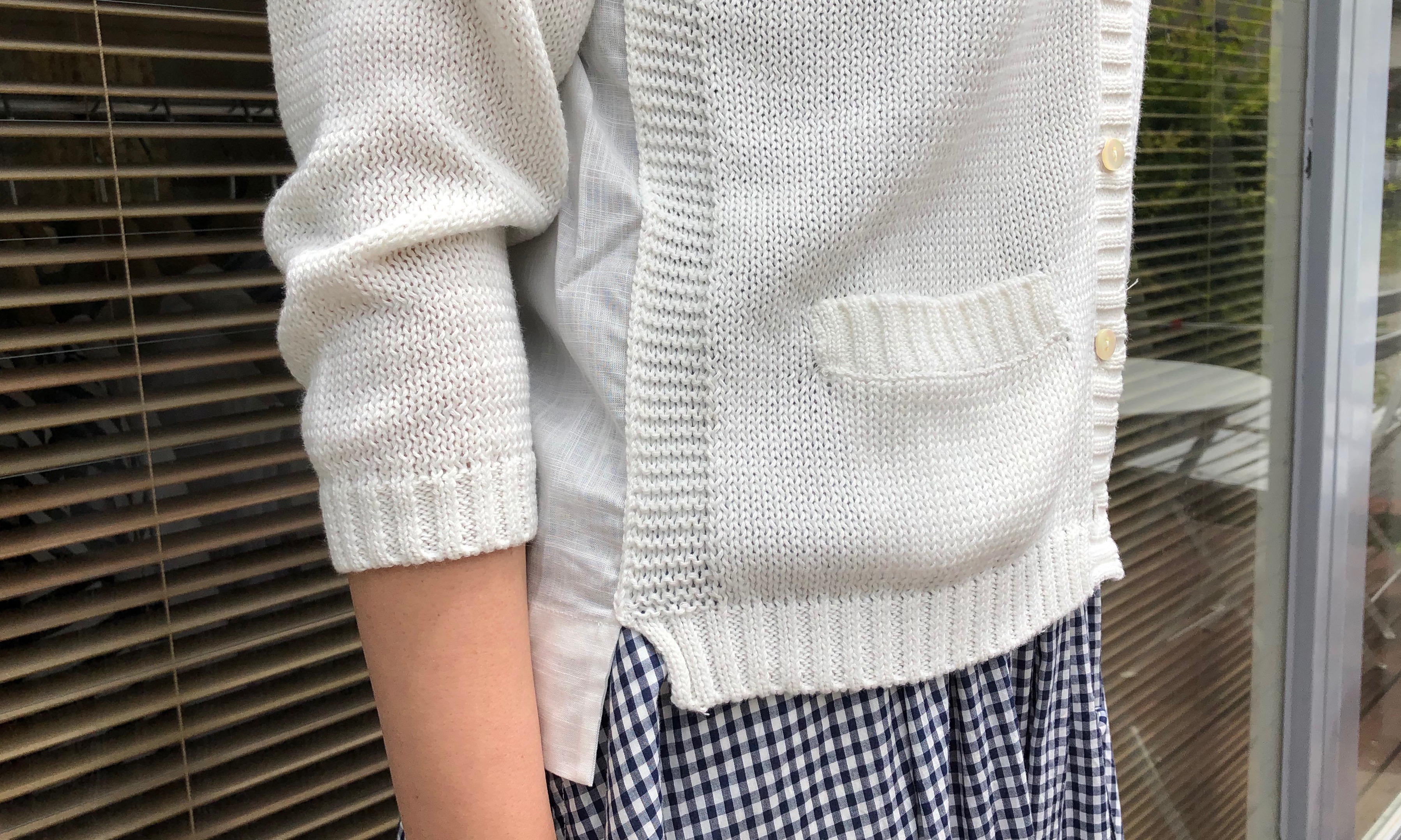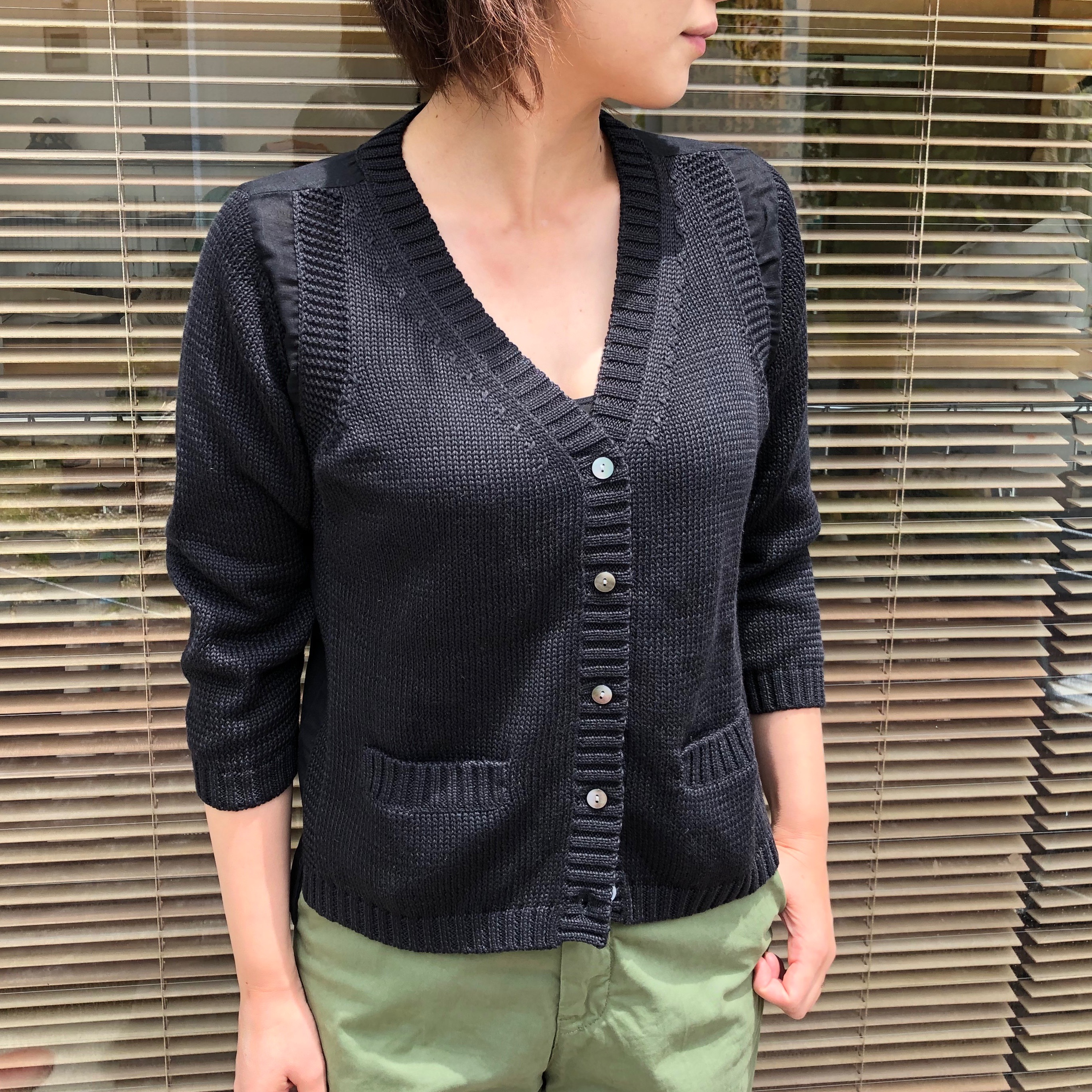 このニットカーディガンも、実は前後の身頃は異素材です。後ろ身頃の布帛部分は、素材が薄く涼し気です。