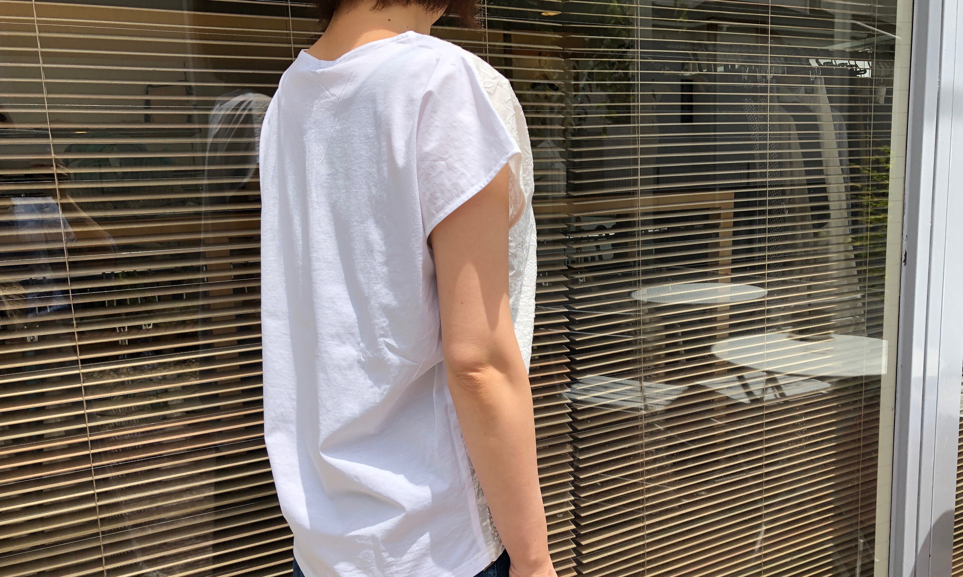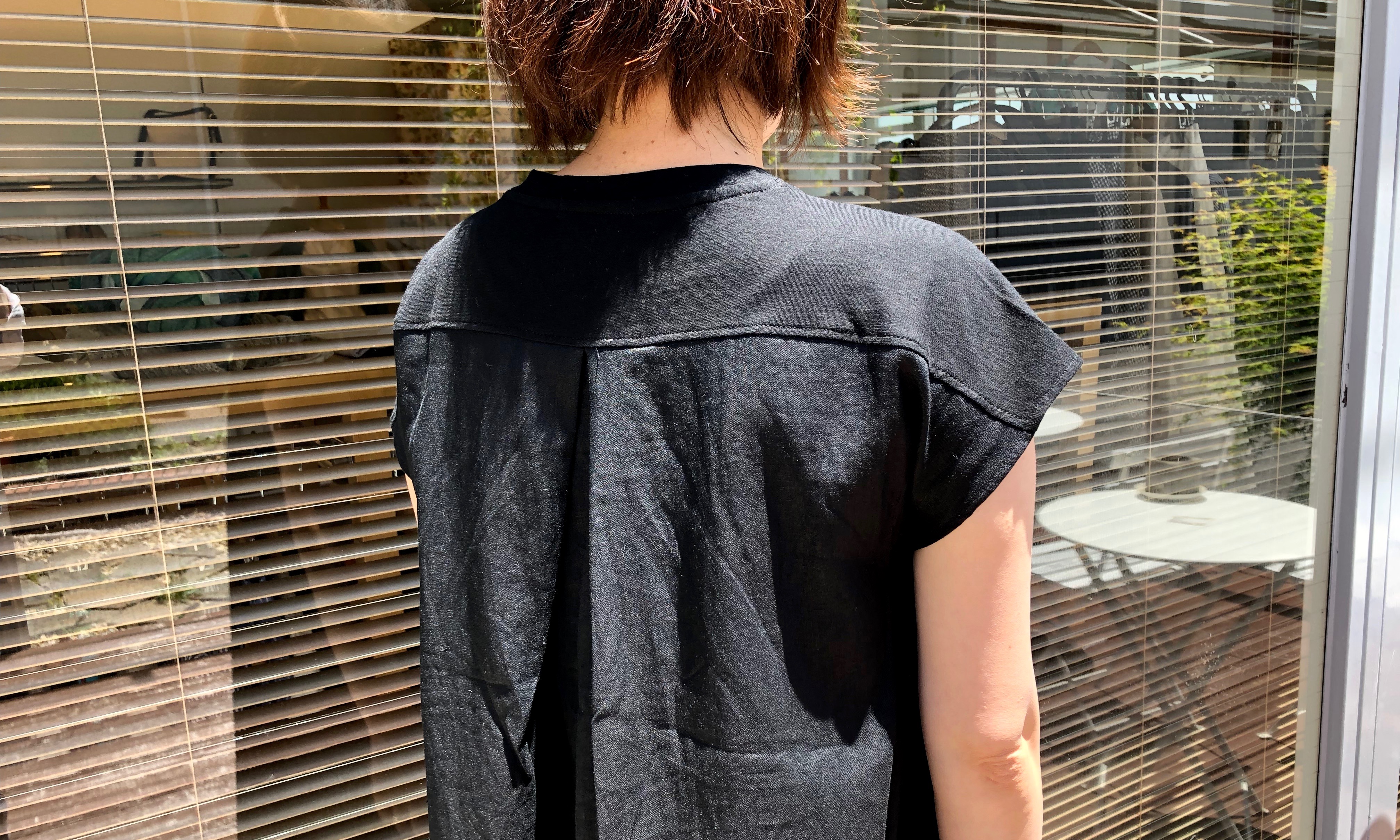 肩より下の後ろ身頃は、リネン素材の切り替えで、涼しく快適です。