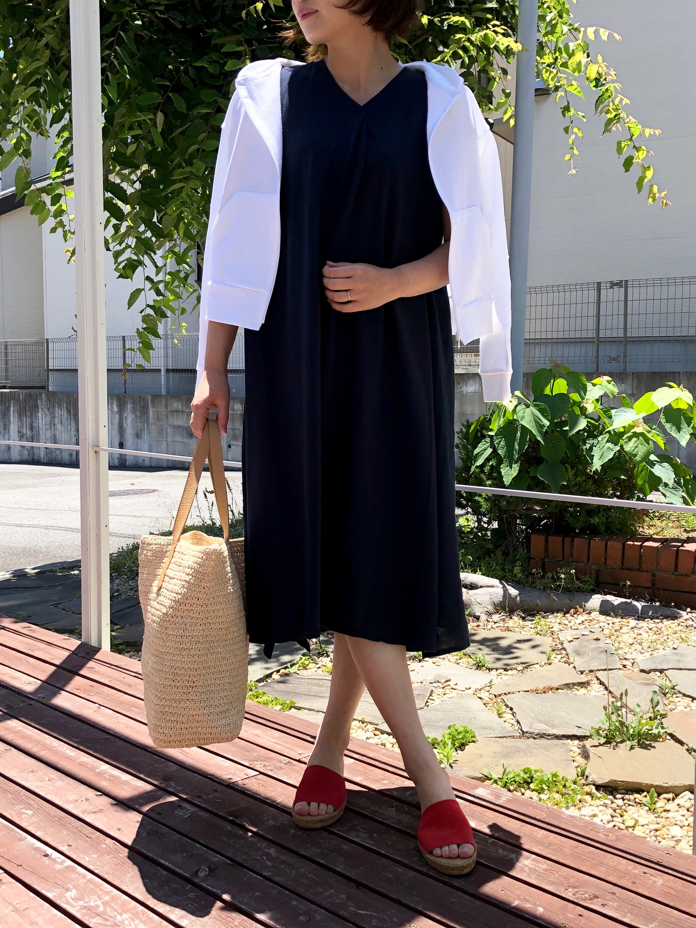 合わせたのは、『le ciel de HARRISS』のワンピース。肌触りの柔らかいガーゼのコットンのワンピース。程よいゆったり感、さっと被って着ることができ、時短アイテムです。